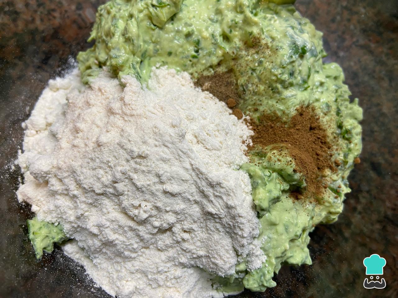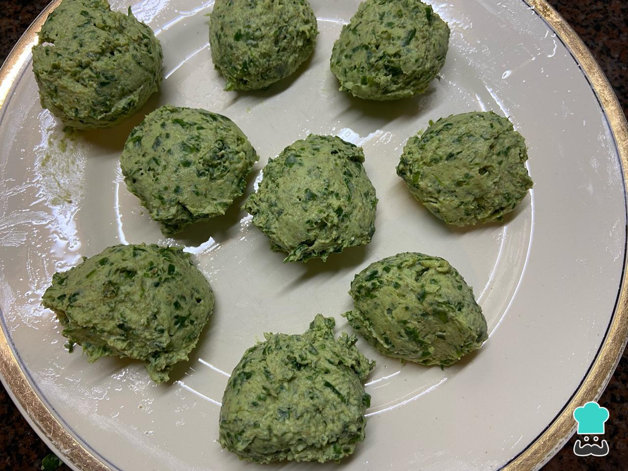 Procesa hasta que se forme una pasta que vertirás en un recipiente para agregar allí la harina y los condimentos (sal, pimienta y nuez moscada). Mezcla con una cuchara para formar la masa. Si notas que aún está demasiado chirle, puedes añadir un poco más de harina, pero no te excedas para que no queden duros. Luego, deja reposar por 15 minutos.