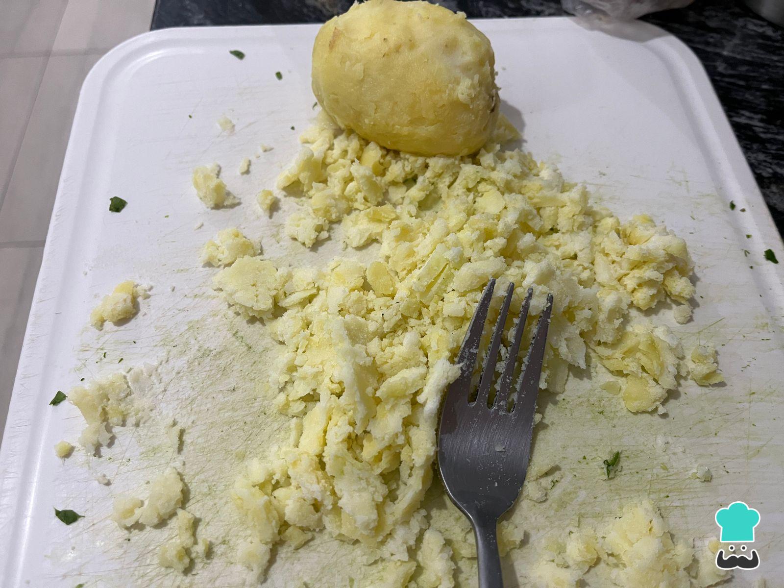 Cuando la papa esté cocida, déjala que se entibie para pelarla sin quemarte, písala para hacer un puré.