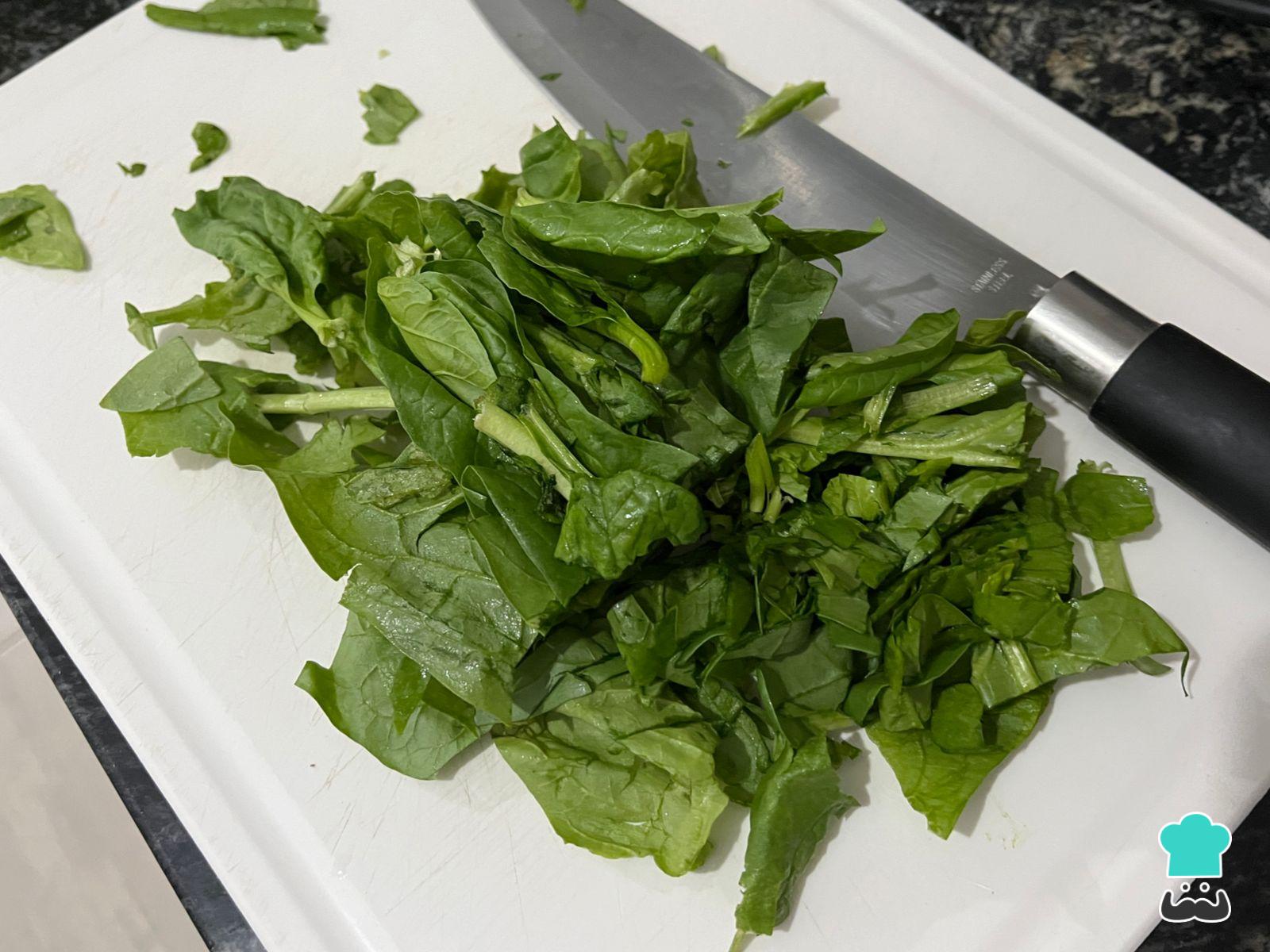 Limpia la espinaca dejándola en remojo con una solución de 1 gota de levandina apta para alimentos por litro de agua. Sumérgela 15 minutos y, luego, escúrrela. Pícala para que se integre bien con los ingredientes, pero no suelte demasiado líquido en tu relleno.