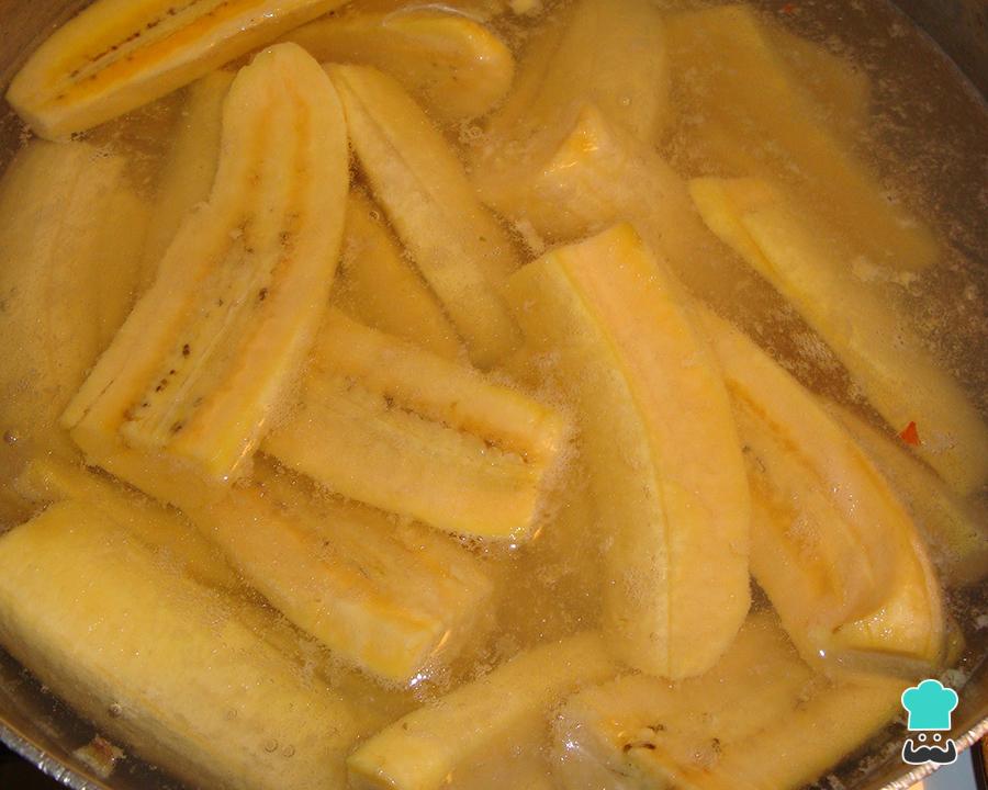 Lo primero que debes hacer para realizar el mangú dominicano es poner las cuatro tazas de agua a hervir junto con la sal. Mientras hierve, retira la piel de los plátanos verdes y córtalos por la mitad. Luego, incorpóralos al agua hirviendo y deja que se cocinen durante 10 minutos.