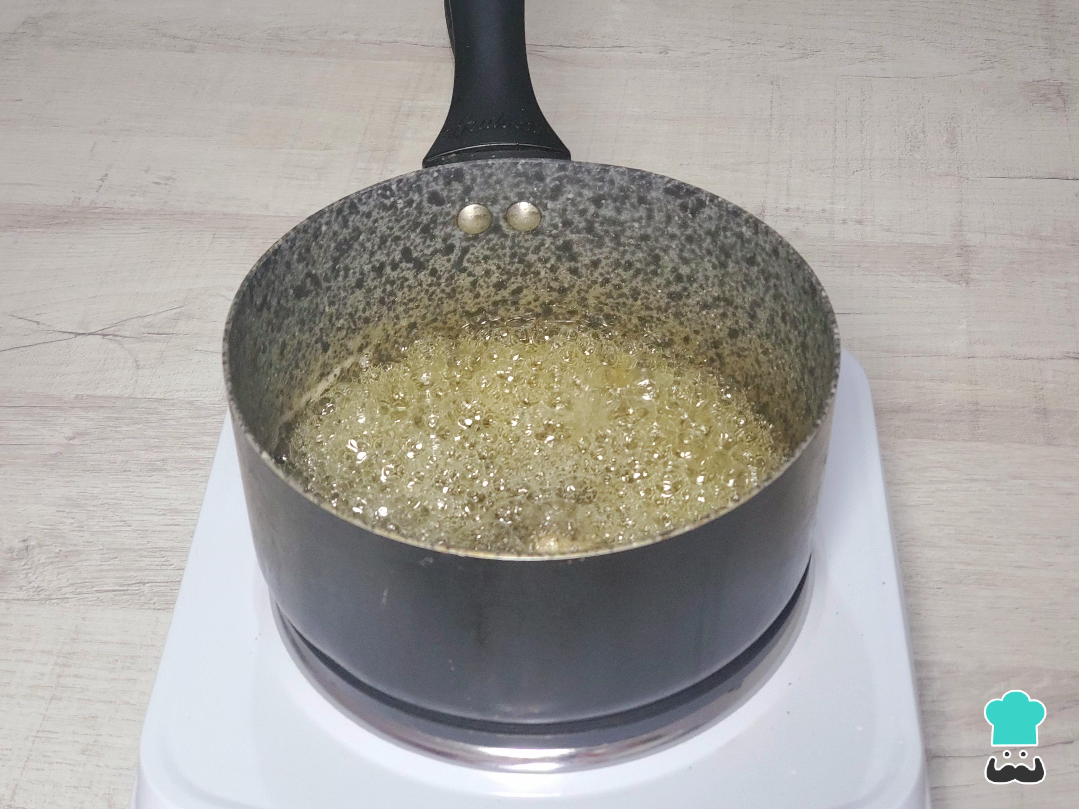 Deja hervir hasta que las burbujas del almíbar revienten más lentamente; si tienes un termómetro en casa, controla la temperatura y deja que llegue a 121 °C.