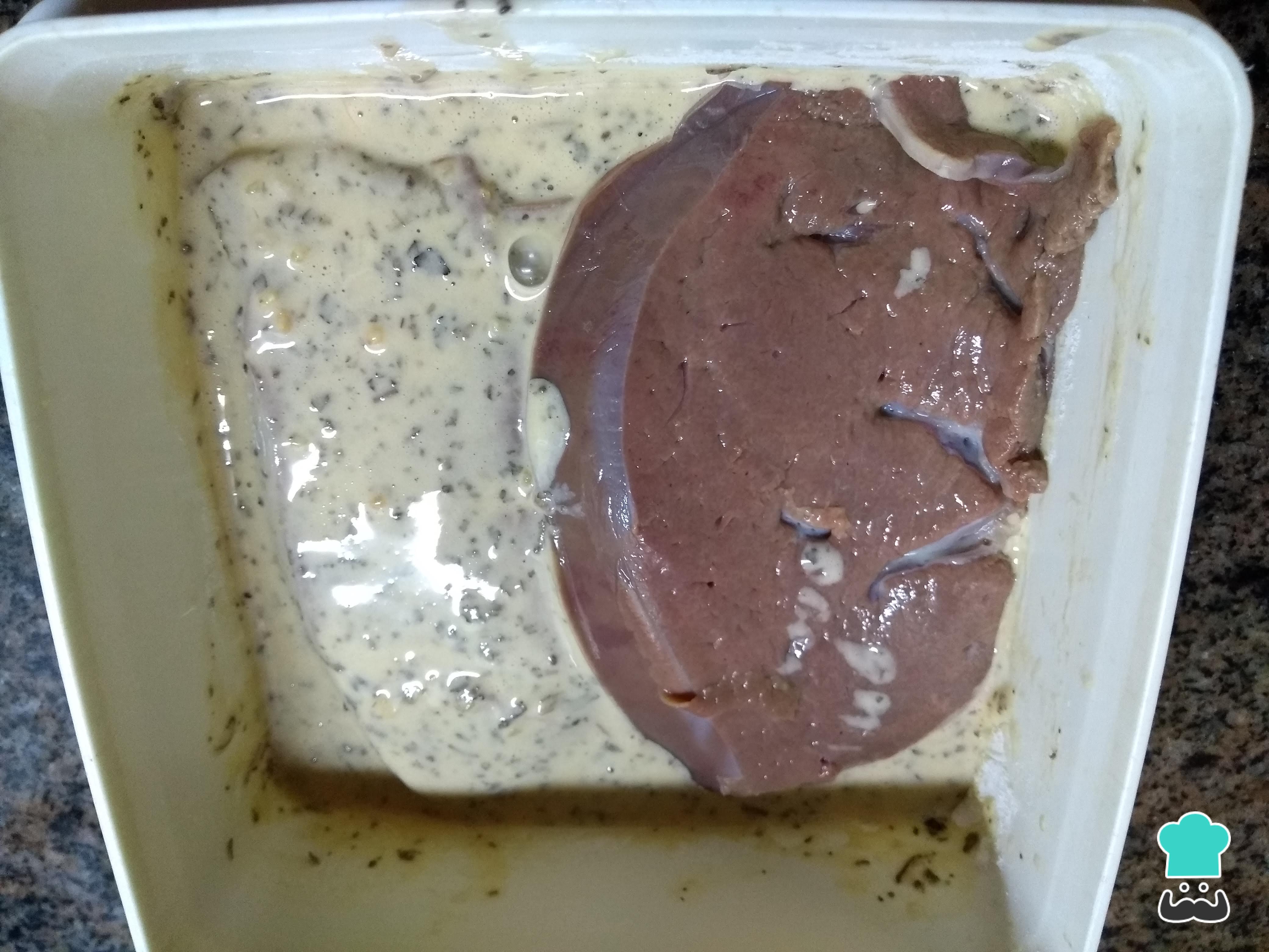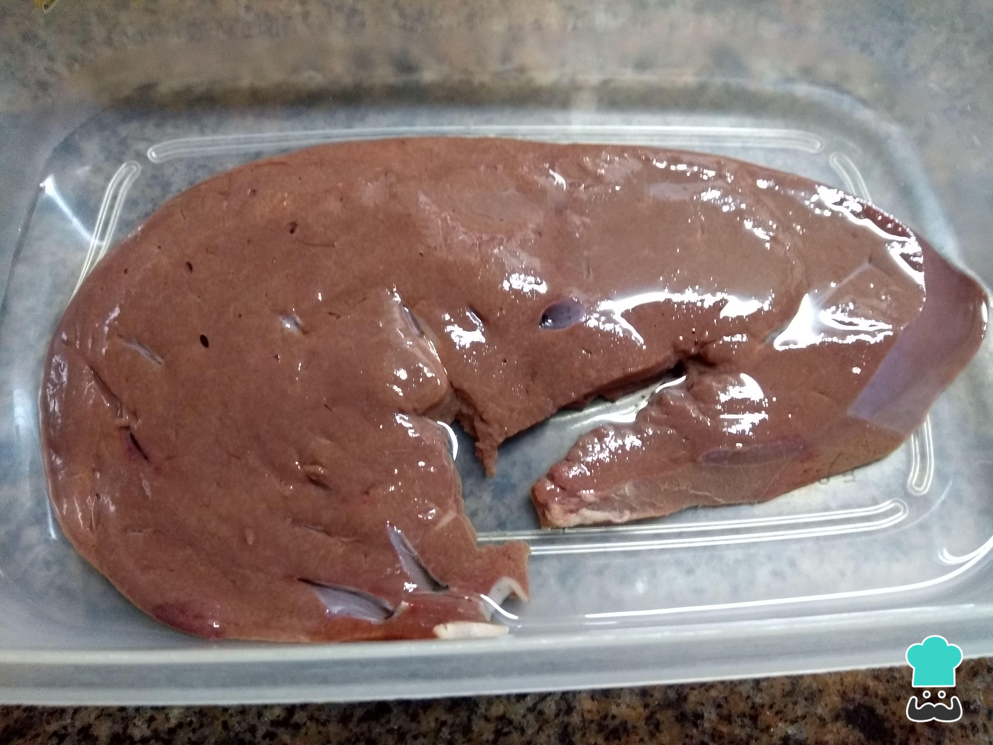 Para empezar con la receta de las marineras de hígado, primero limpia el hígado retirando venas y nervios. A continuación, colócalo en remojo con el jugo del limón. Reserva en la heladera durante 1 hora.