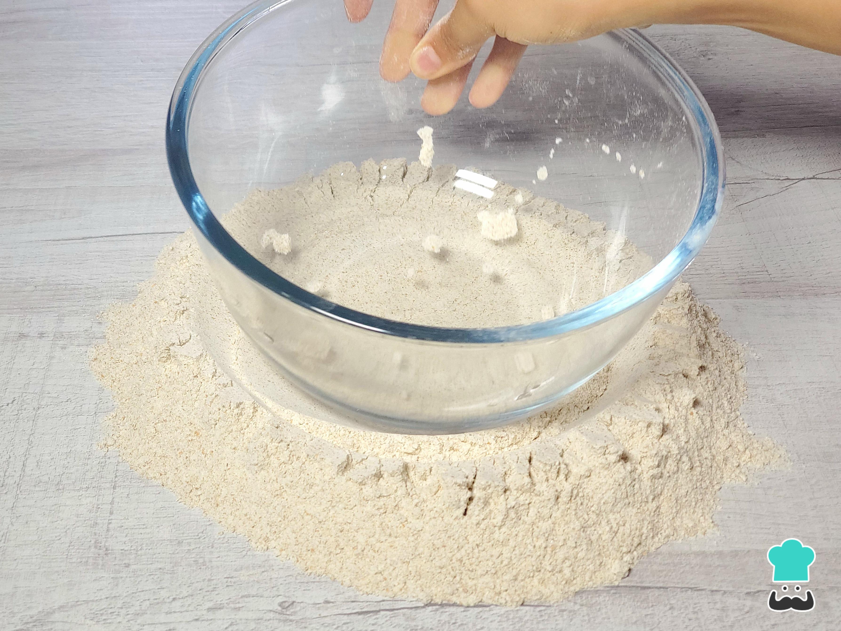 Para comenzar, coloca en un bowl los ingredientes secos: harina integral, sal, azúcar (o miel, si lo prefieres) y levadura seca. Mezcla bien para que todo quede integrado.