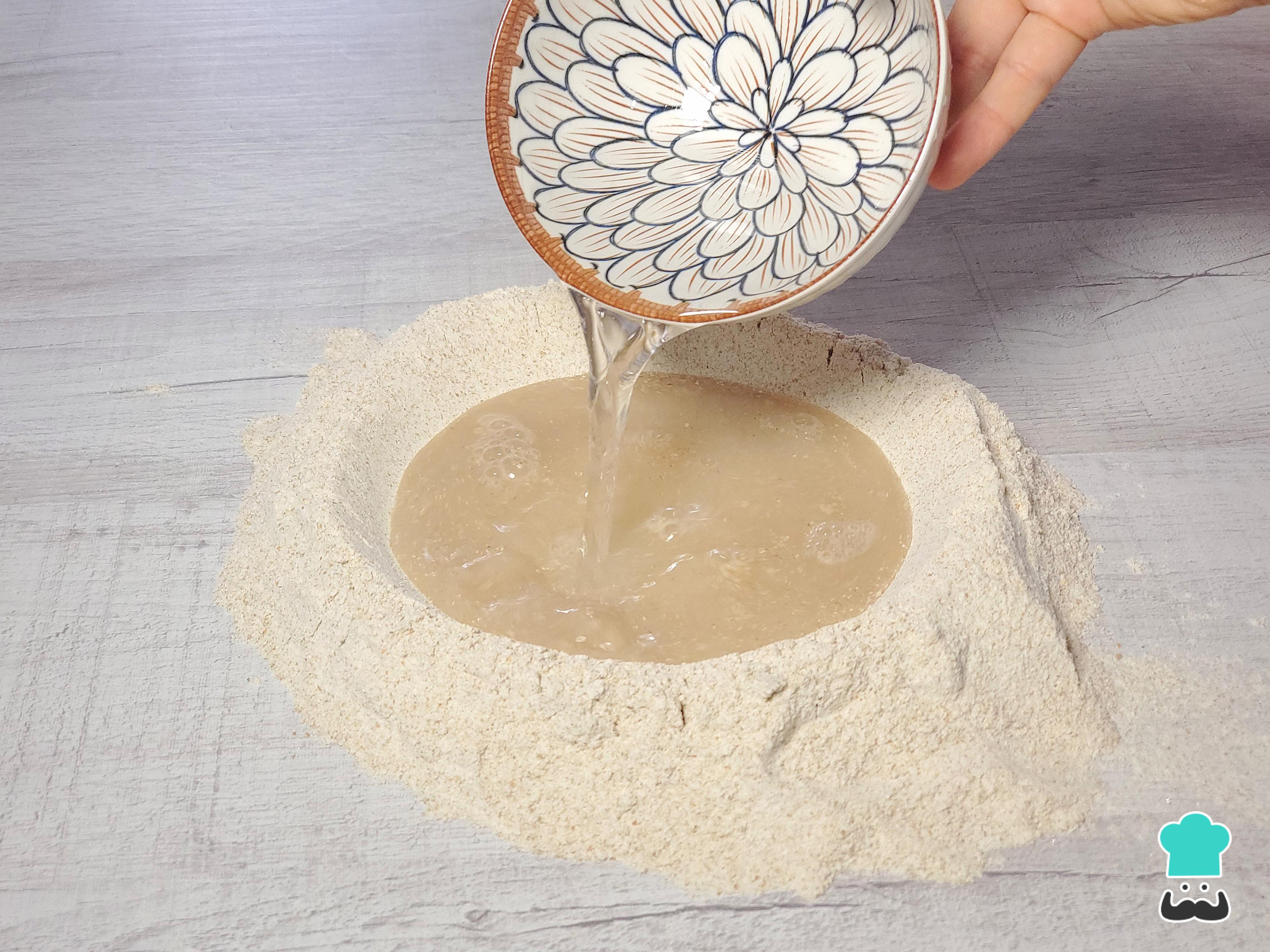 Vuelca la mezcla seca sobre la mesa de trabajo y haz un hueco en el centro, como si formaras un volcán. Si te resulta más cómodo, puedes usar la base del bowl para darle forma.