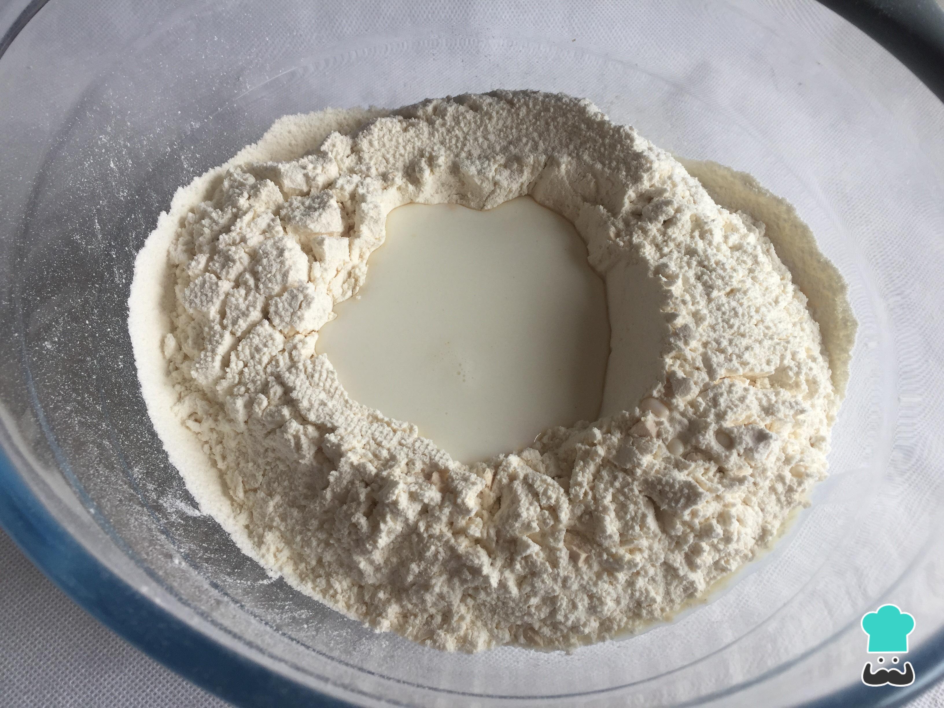 Para empezar a hacer la masa para donas deberás colocar la harina en un tazón amplio, formar un volcán con ella y añadir en el centro la leche y la levadura.