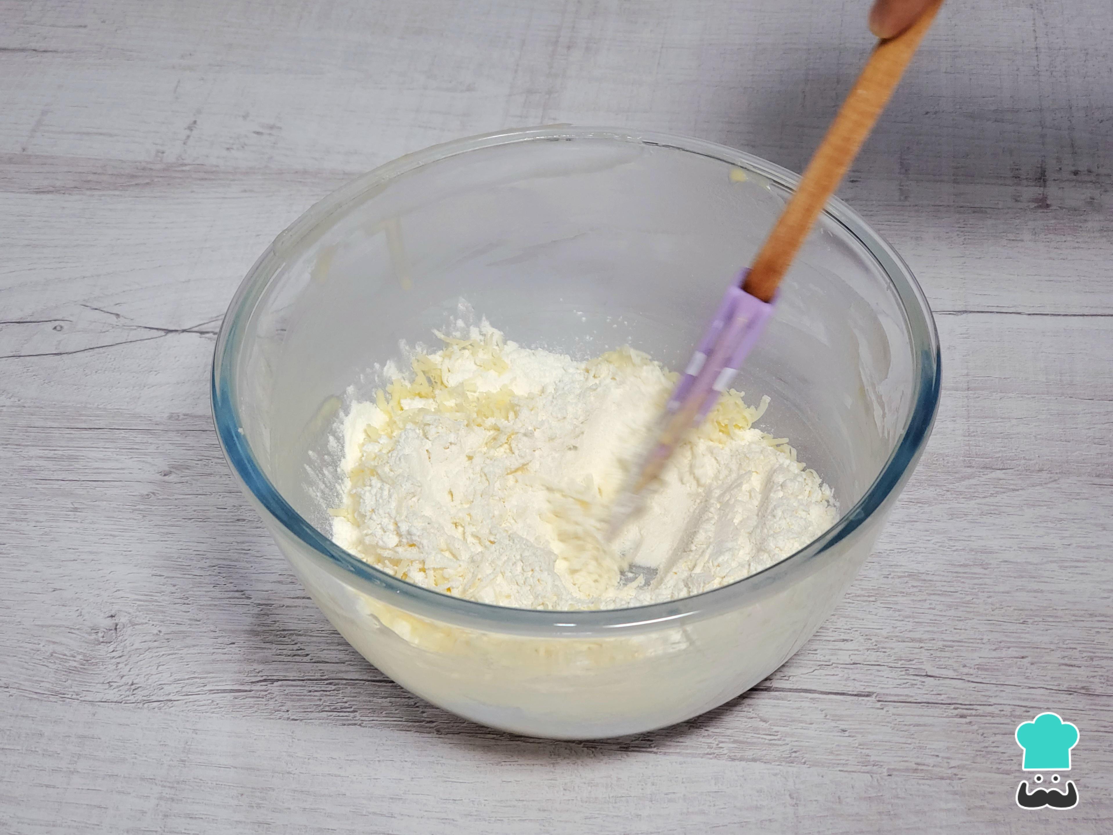 Para preparar estas deliciosas masitas fritas, comienza colocando en un bowl la harina y el queso. Agrega también la sal y el azúcar, y mezcla bien.