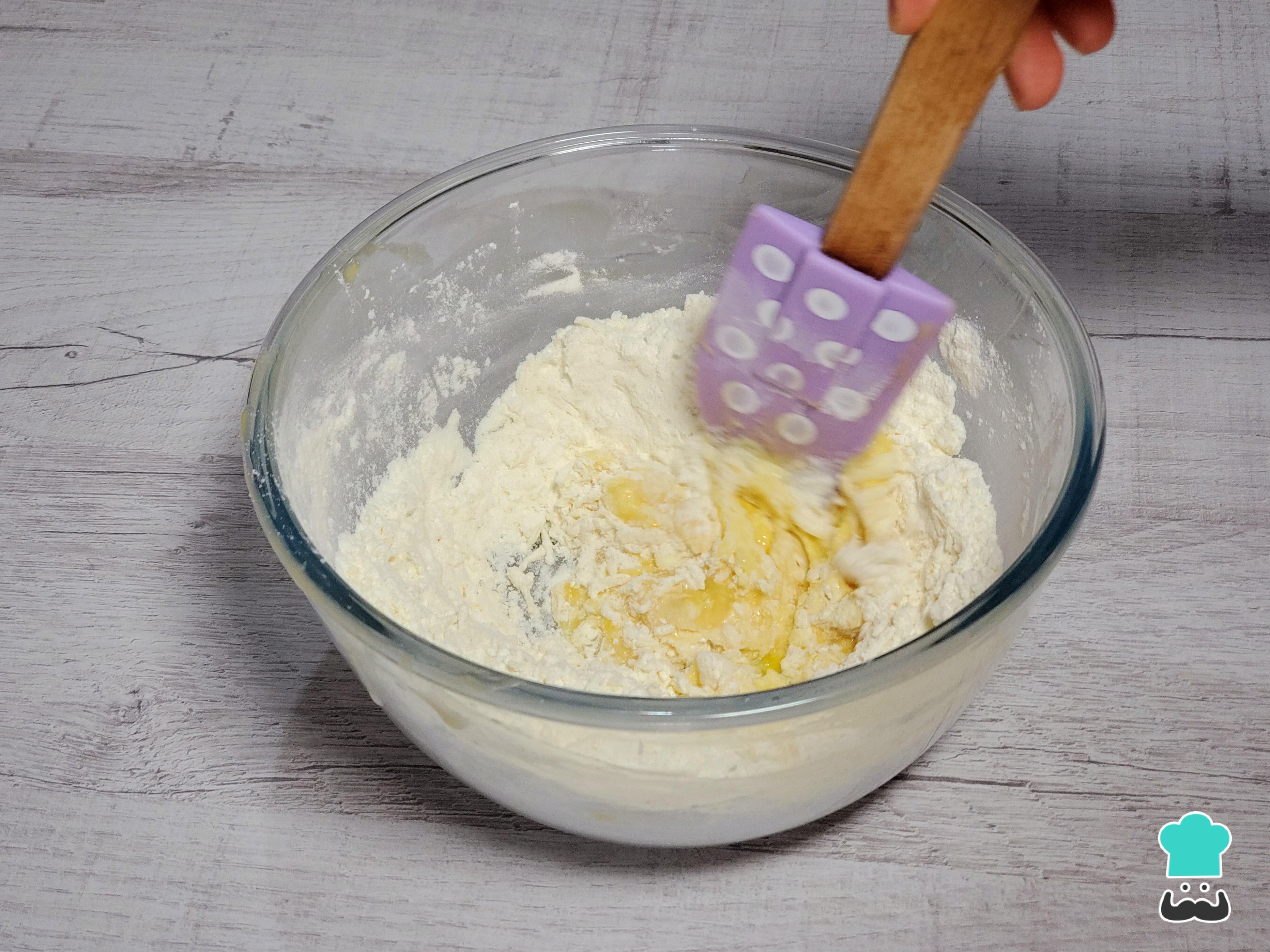 Incorpora la leche y el huevo, batiendo hasta que la mezcla comience a formar una masa compacta.