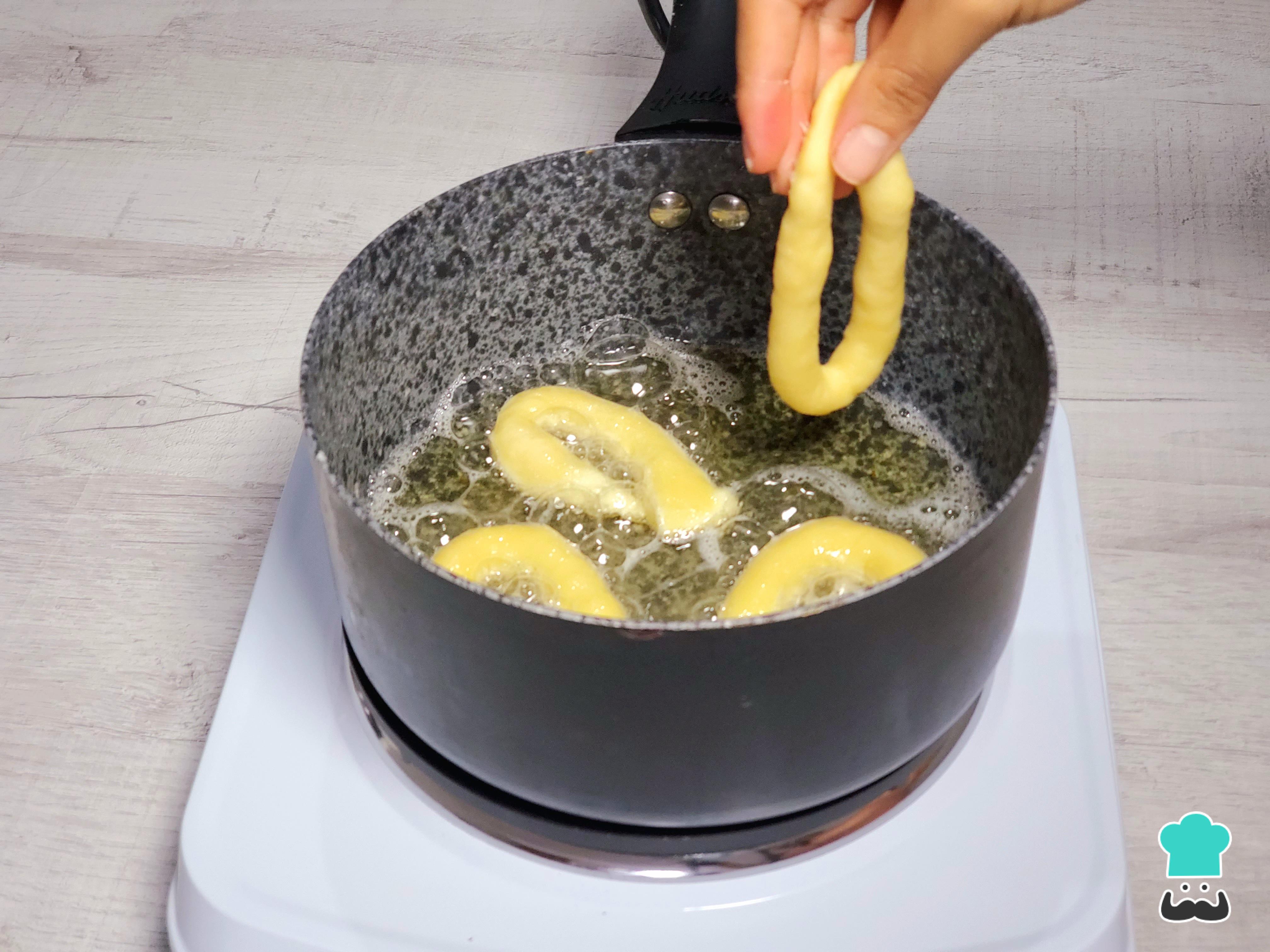 Cuando tengas todas las masitas listas, calienta una olla con abundante aceite. Para comprobar si la temperatura es adecuada, introduce una pequeña bolita de masa en el aceite; si burbujea inmediatamente, está listo para freír.