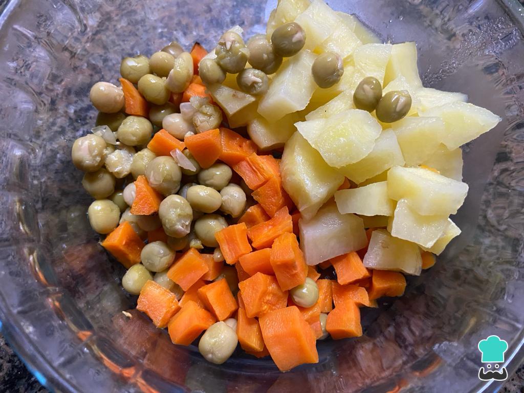 Cuando estén cocidos ambos vegetales, déjalos enfriar y mezcla en una ensaladera junto con las arvejas. Para terminar, puedes incorporar mayonesa y servirlo a modo de ensalada o bien salterarlo en sartén con una cucharada de aceite y un diente de ajo, como un panaché.