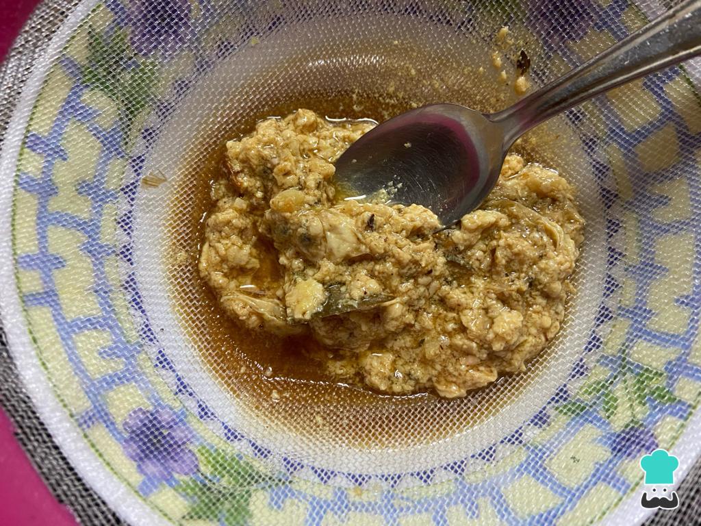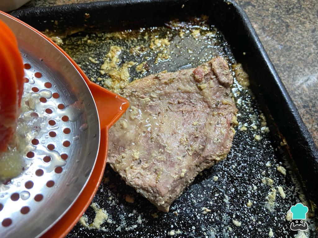 Retira la asadera del horno y cuela el fondo que haya quedado, reserva el líquido y descarta una especie de nata cortada que puede formarse.