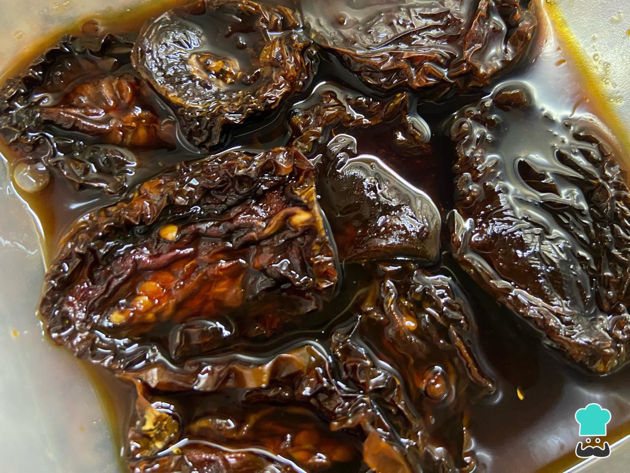 Hidrata los tomates secos con agua caliente por unos 10 minutos. Sécalos con papel absorbente.
