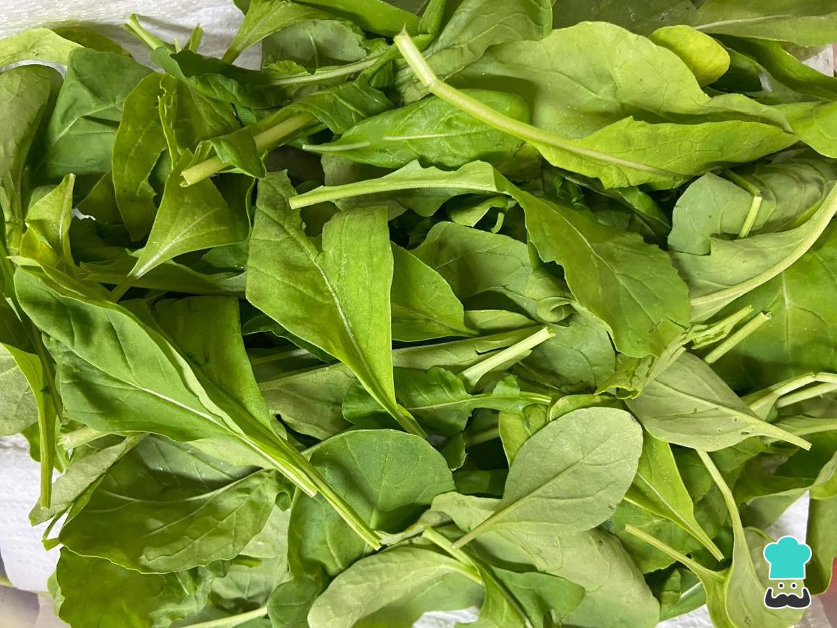 Retira los cabos de las hojas de rúcula, lávalas muy bien y sécalas con papel absorbente o un paño seco y limpio.