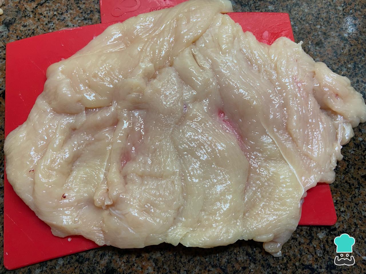 Si las supremas de pollo tienen algún resto de grasa o cartílagos, retíralos. Luego, ábrelas en 3 partes o córtalas en filetes.