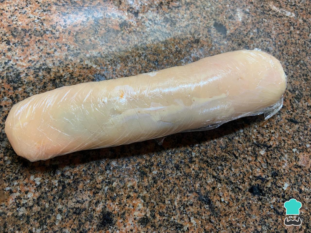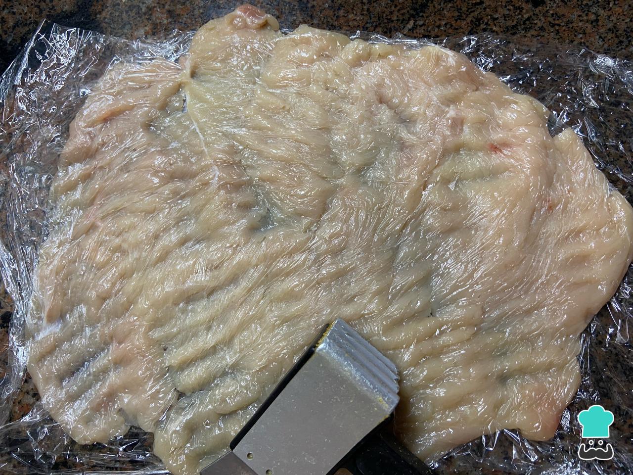 Despliega una lámina de film transparente sobre la mesada y apoya los filetes de suprema, encimándolos entre sí sin dejar espacios. Cubre con otra porción de film y, luego con un martillo, palote o incluso con la palma de la mano, golpéalas para aplanar y unificar las porciones de pollo.