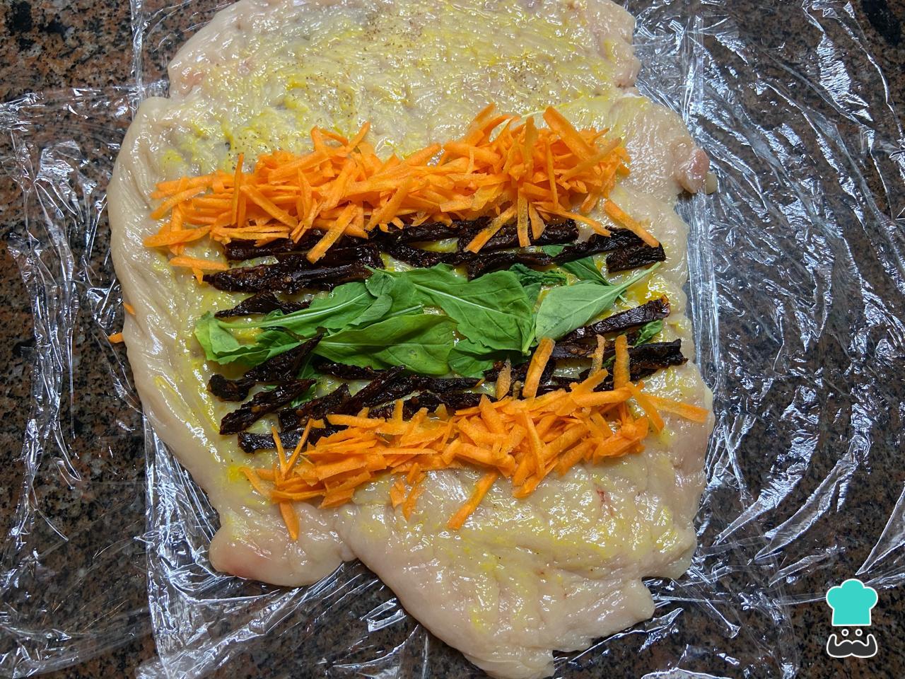 Retira el film superior y vuelve a revisar que no queden agujeros. Cuando esté todo parejo, agrega sal y pimienta y unta con mostaza la superficie. Distribuye los ingredientes del relleno haciendo franjas con los tomates deshidratados, la zanahoria, y las hojas de rúcula.