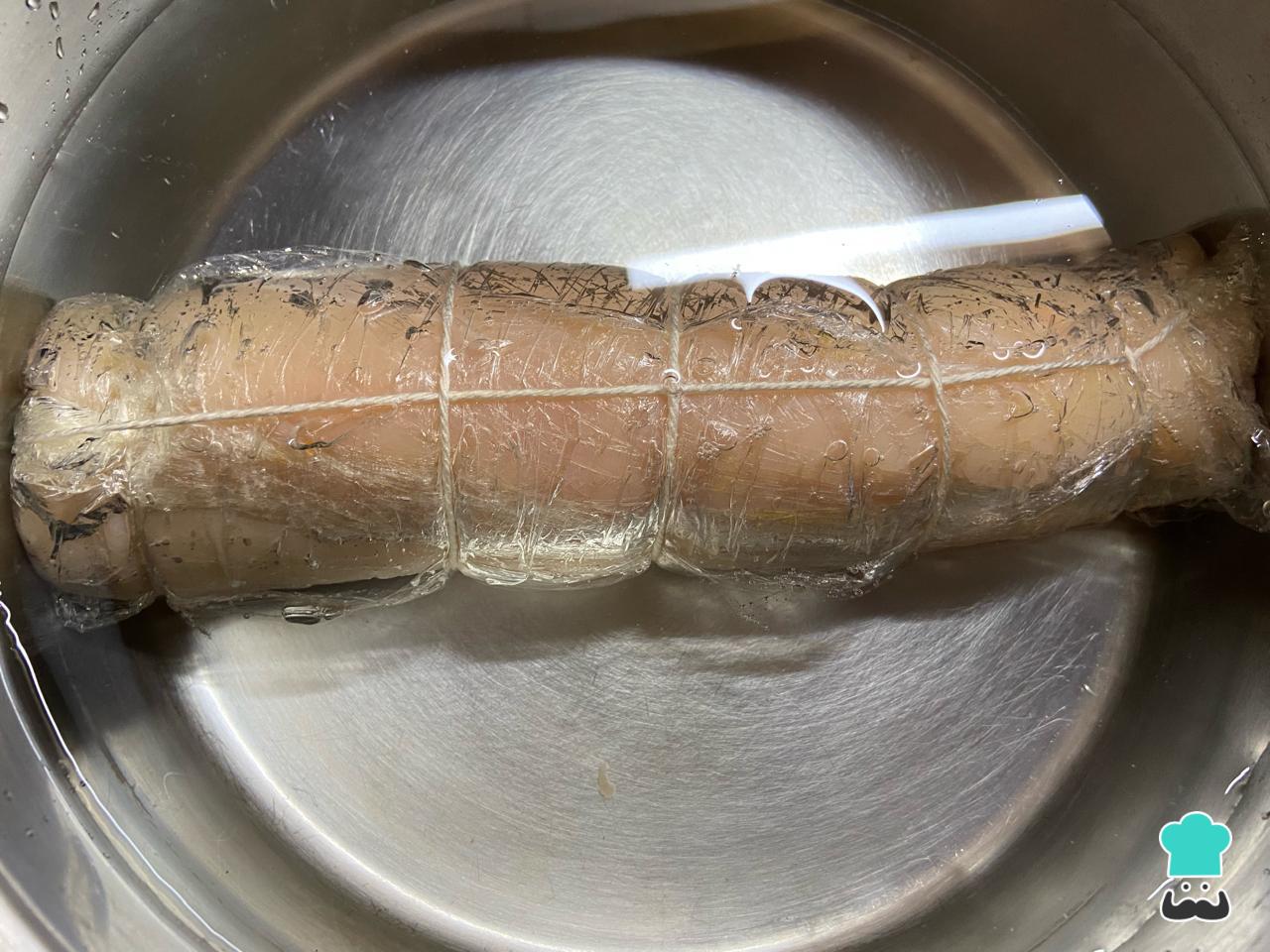 Ata con hilo para mantener la forma y coloca dentro de una olla con agua y lleva al fuego. Cuando el agua hierba, lleva a fuego bajo y deja cocinar tapado por 40 minutos a 1 hora, dependiendo del tamaño del matambre o arrollado de pollo.