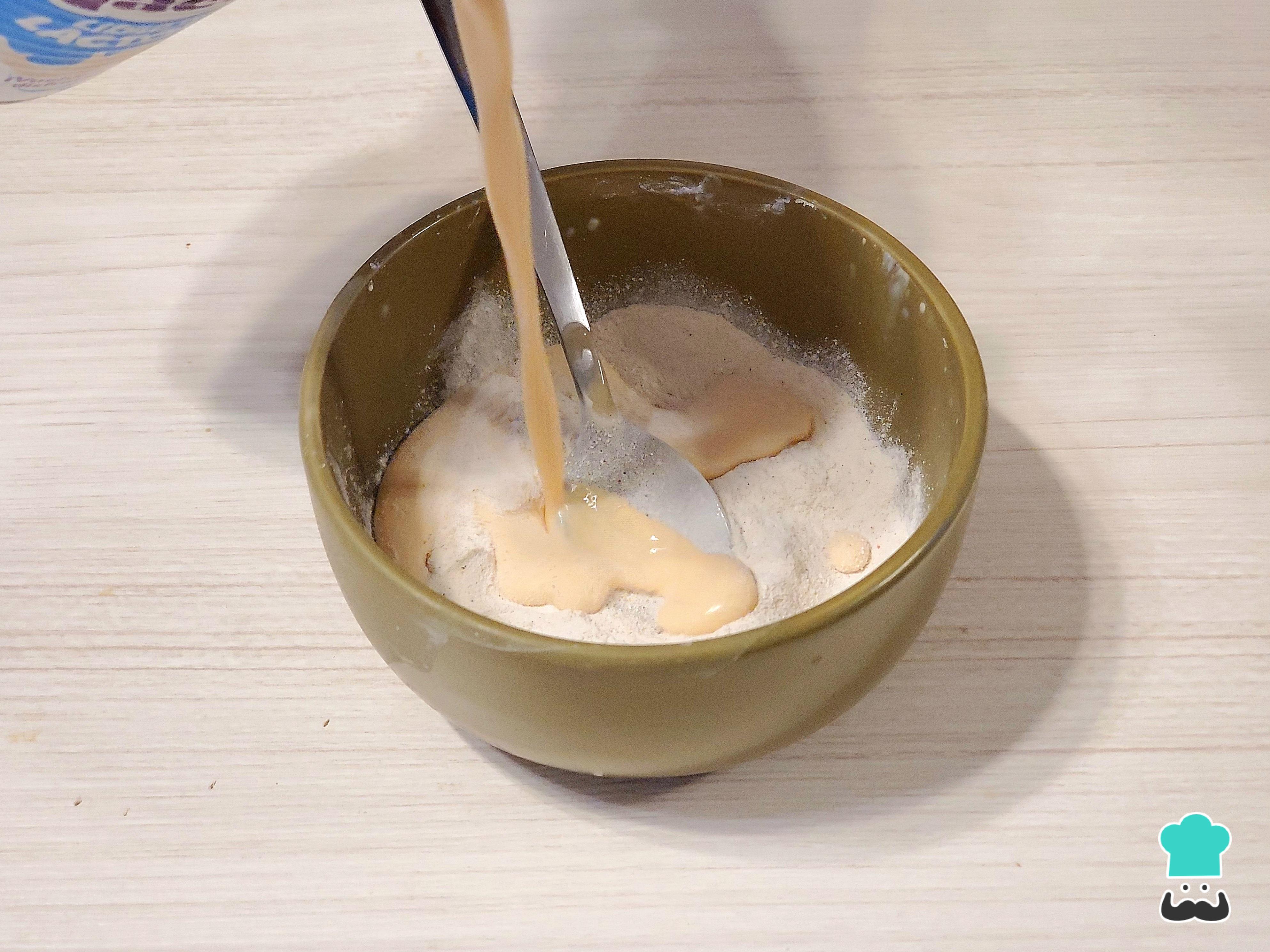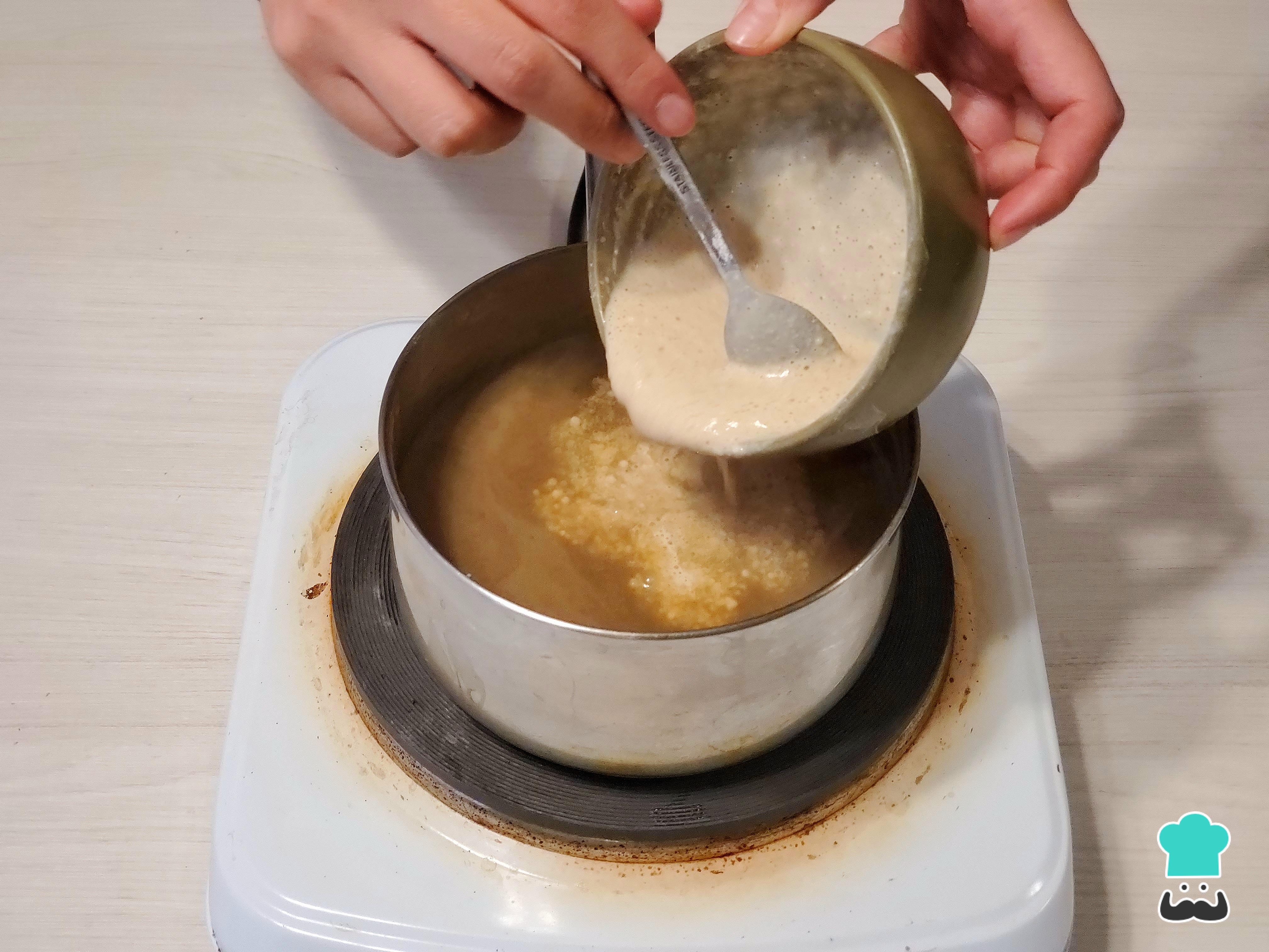 Vierte esta mezcla en el almíbar e inmediatamente con el batidor de globo comienza a remover para evitar que se apelmace y se formen grumos.