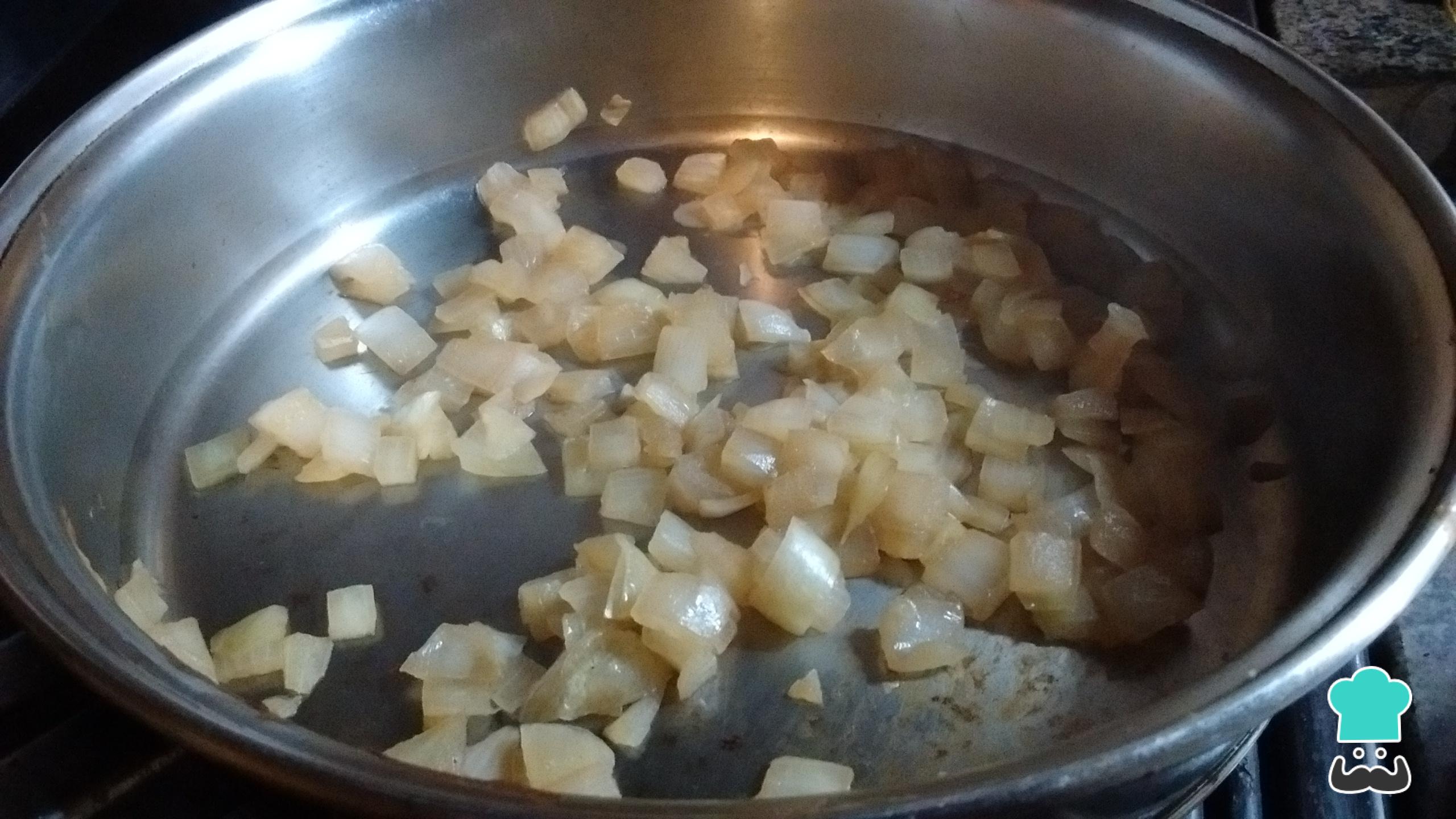 Pela y pica la cebolla para saltearla en una sartén antiadherente con 1 cucharadita de aceite. Cuando esté transparente, baja el fuego al medio y continúa salteando hasta que caramelice. Si notas que se está secando y pegando, añade 1 cucharada de agua caliente para que levante el fondo de cocción, pero no tanto como para hervirla. Repite cuantas veces sea necesario.