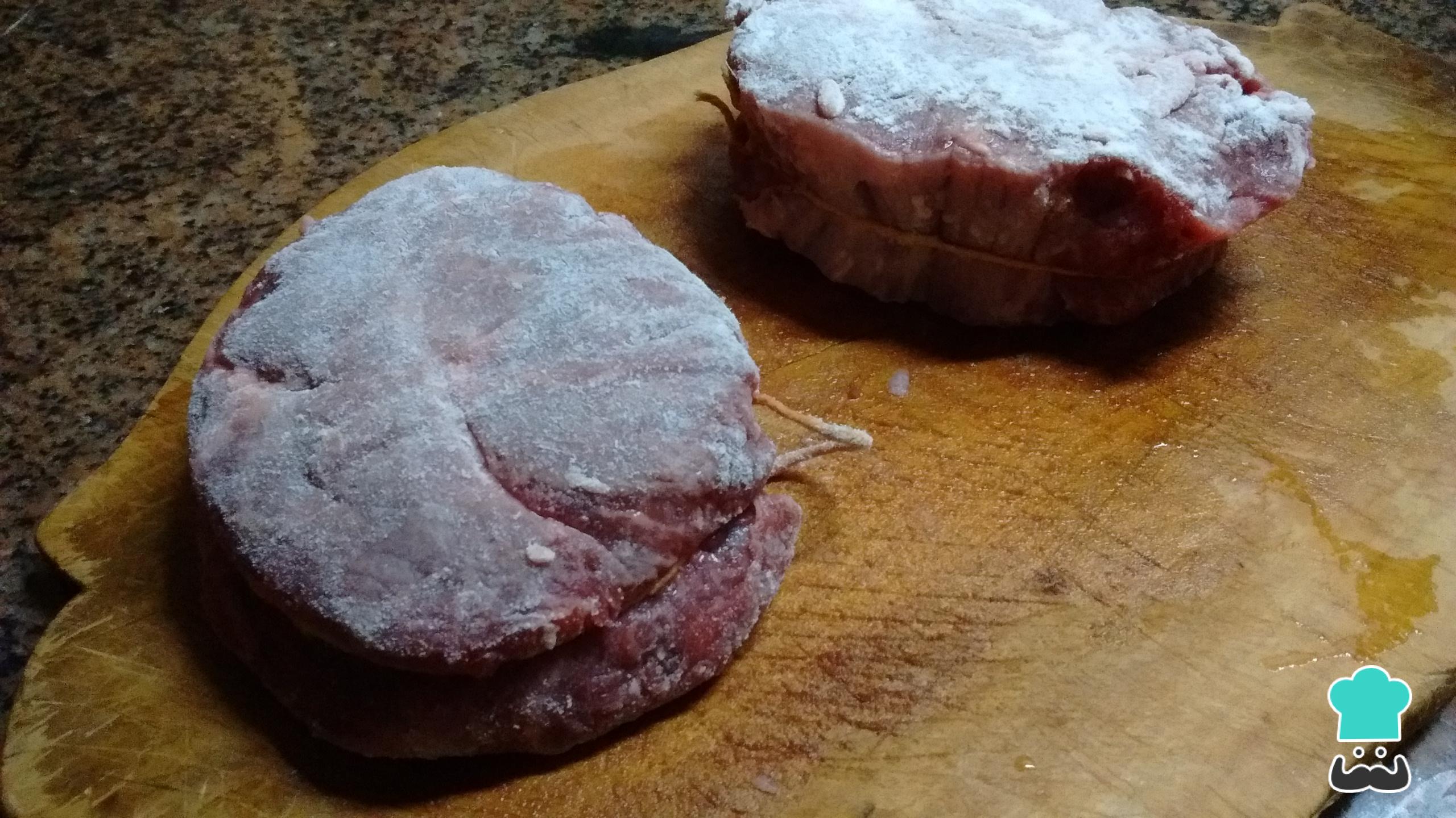 Mientras, limpia los medallones de lomito y átalos con un hilo de cocina para que mantengan su forma redondeada durante la cocción. Reboza los medallones con la harina para que al cocinarlos primero se sellen y le aporten a la salsa algo de cremosidad. Este punto es clave para que la carne quede bien jugosa, ya que esa capa dorada hace que los jugos queden concentrados dentro del corte de carne.