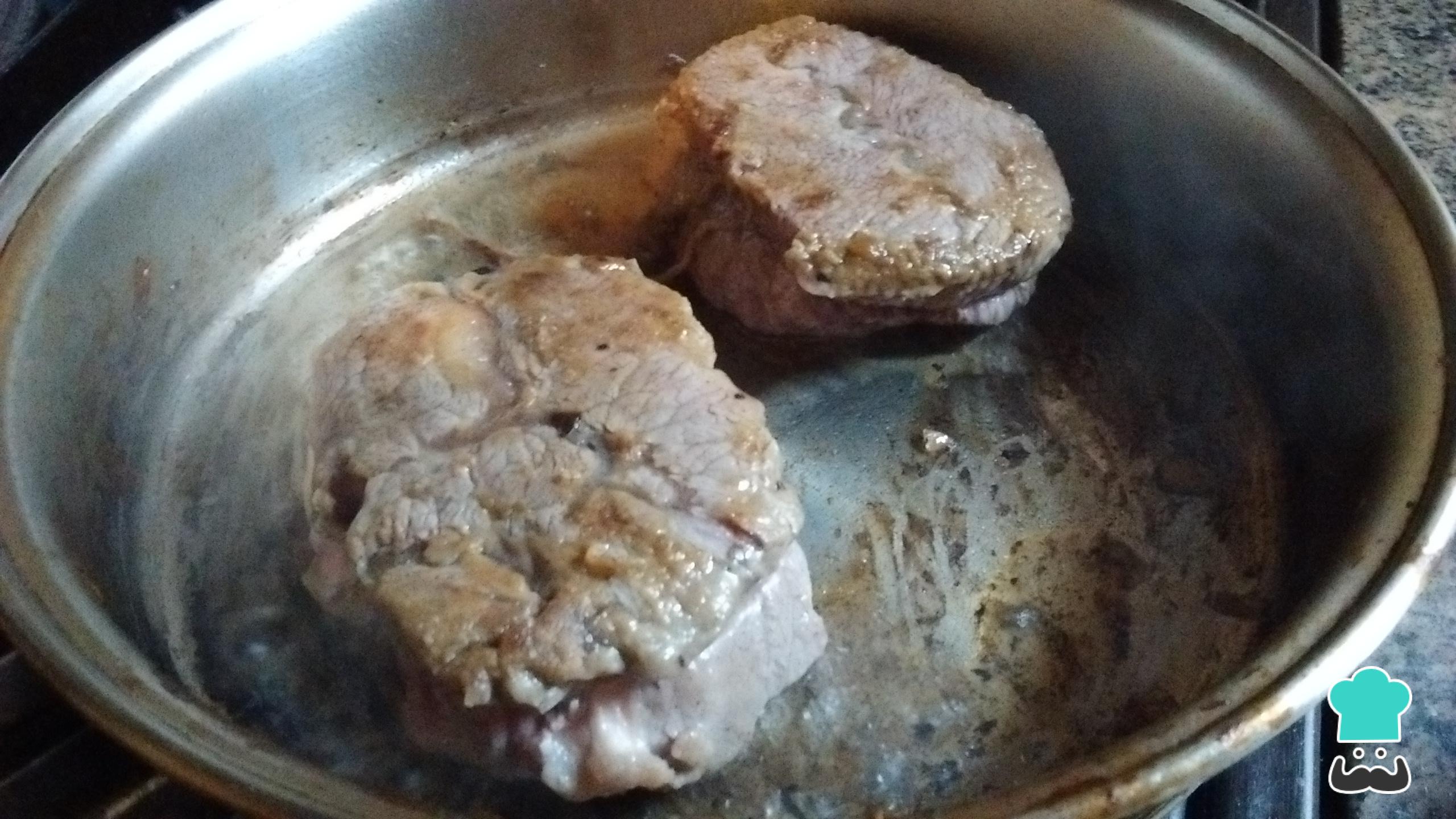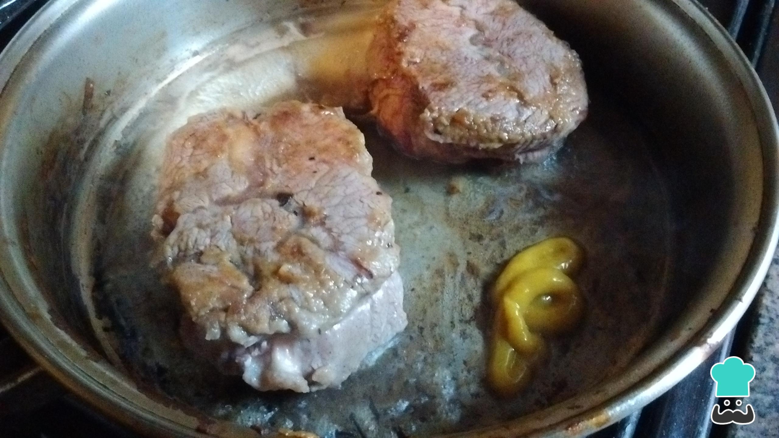 Cuando tus medallones de lomito estén dorados por ambos lados, añade el vino blanco junto con la mostaza. Remueve para que no se formen grumos y mantén el fuego alto hasta que el olor cambie de ácido a dulce, así sabrás que se ha evaporado todo el alcohol.