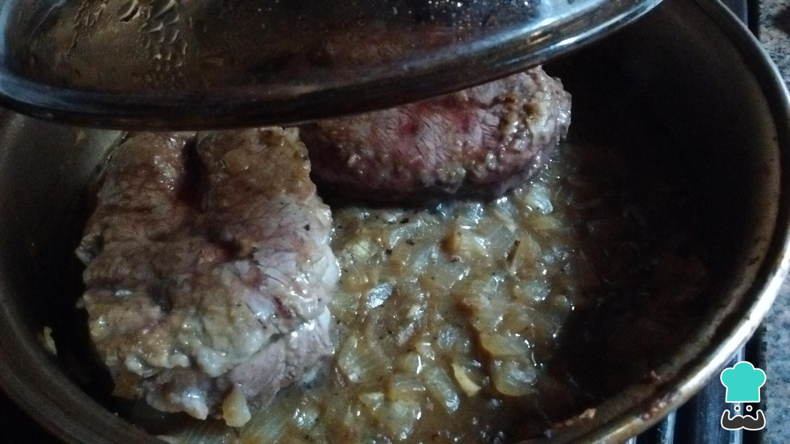 Por último, agrega al salteado la cebolla y baja el fuego a medio. A continuación, añade un difusor debajo y tápalo. Esto hará un efecto horno para que la carne se cocine por completo. Para saber que está lista, deberás ver que los jugos de la carne cambian de rojos, como ves en la imagen, a traslúcidos marrones.