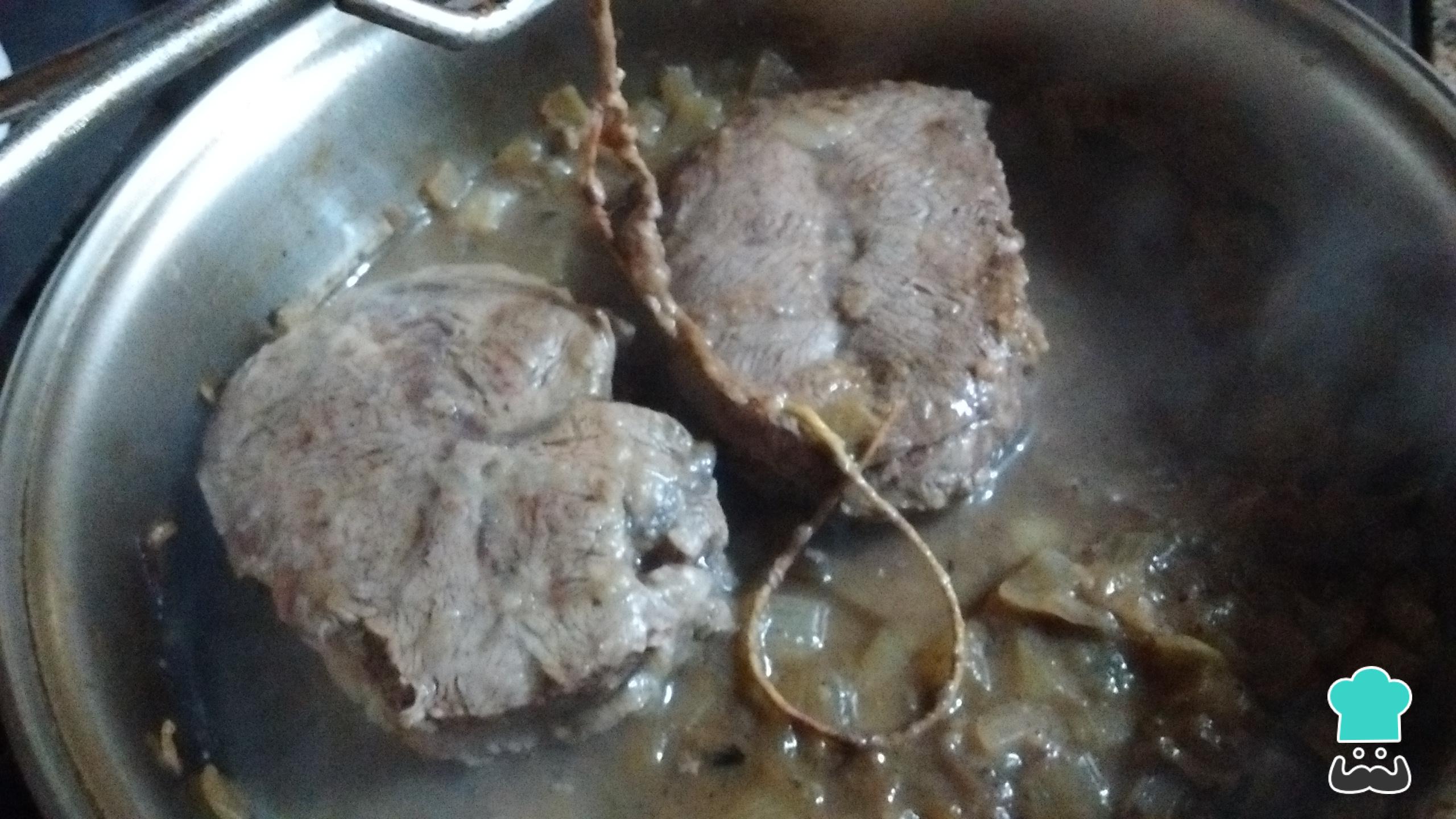 Cuando la cebolla esté caramelizada, retírala de la sartén y, en el mismo fondo de cocción, añade 1 cucharadita extra de aceite para sellar la carne vuelta y vuelta. No la muevas hasta que esté dorada o se pegará la harina a la sartén. En este punto no buscamos cocinar la carne, solo dorarla.