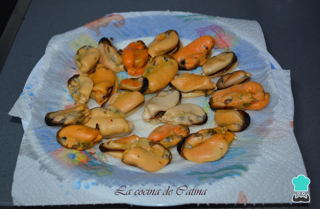 Una vez fríos, sacamos la carne de los mejillones de sus conchas y los ponemos sobre papel absorbente para que eliminar el líquido que puedan tener.