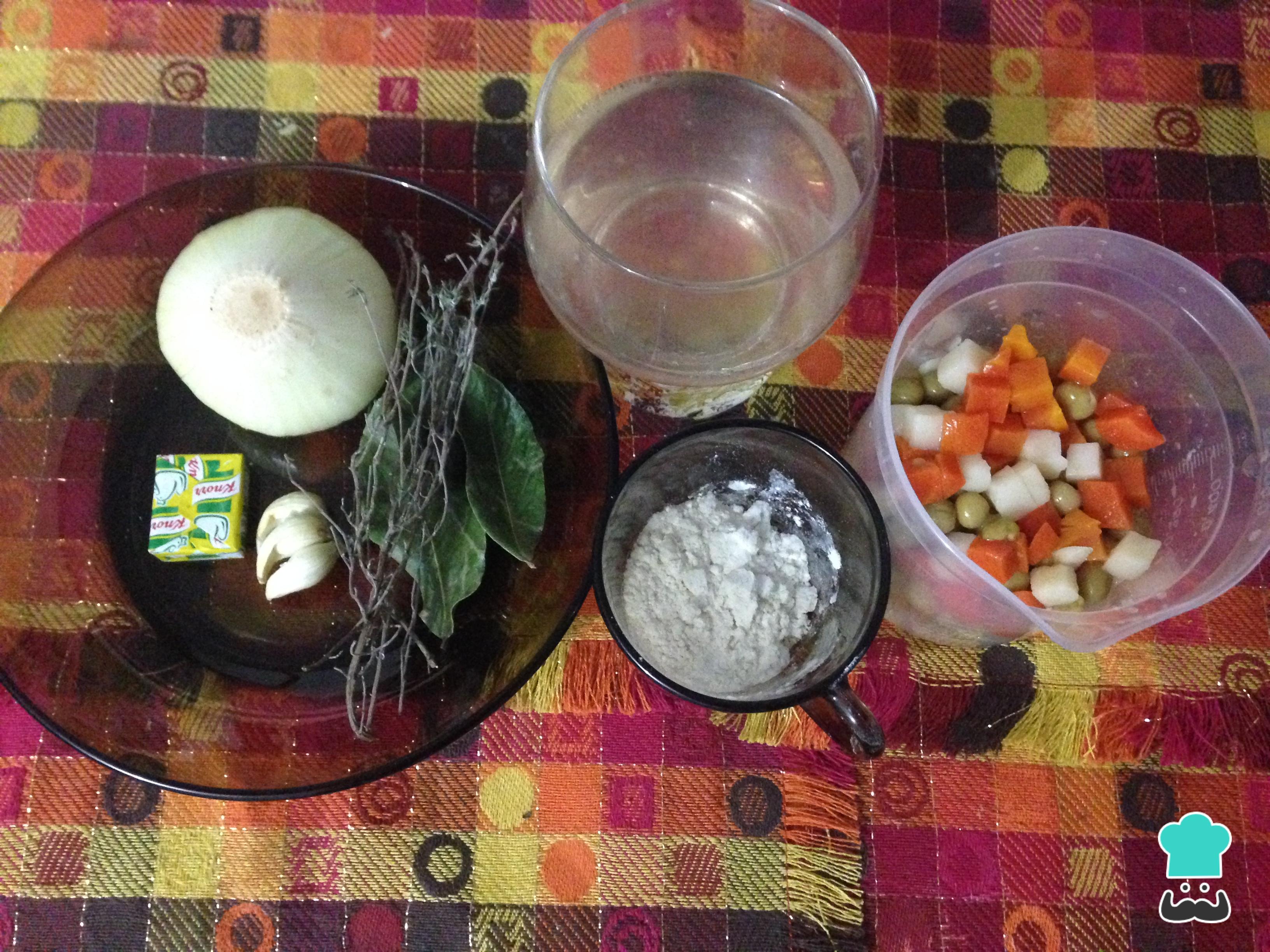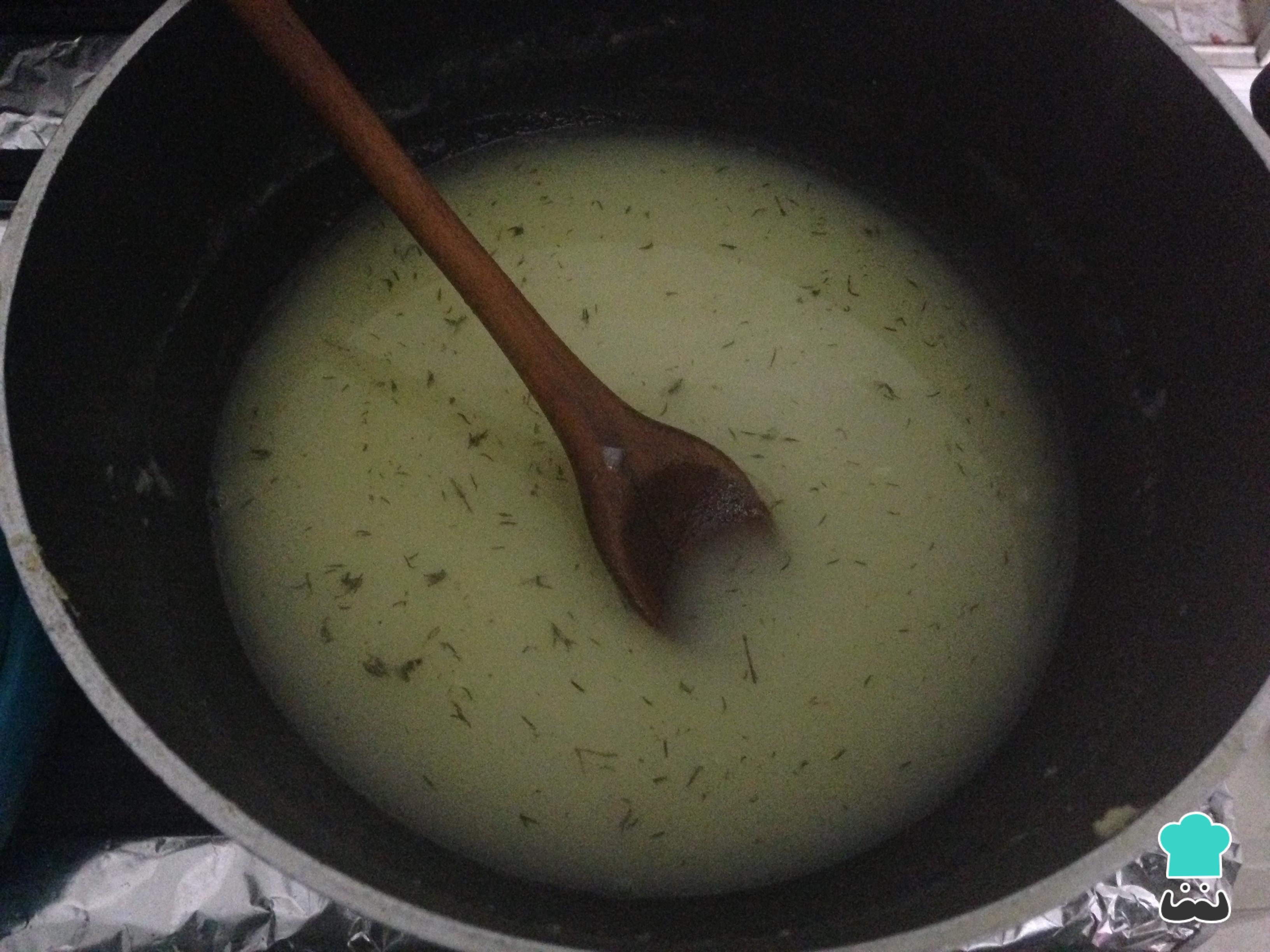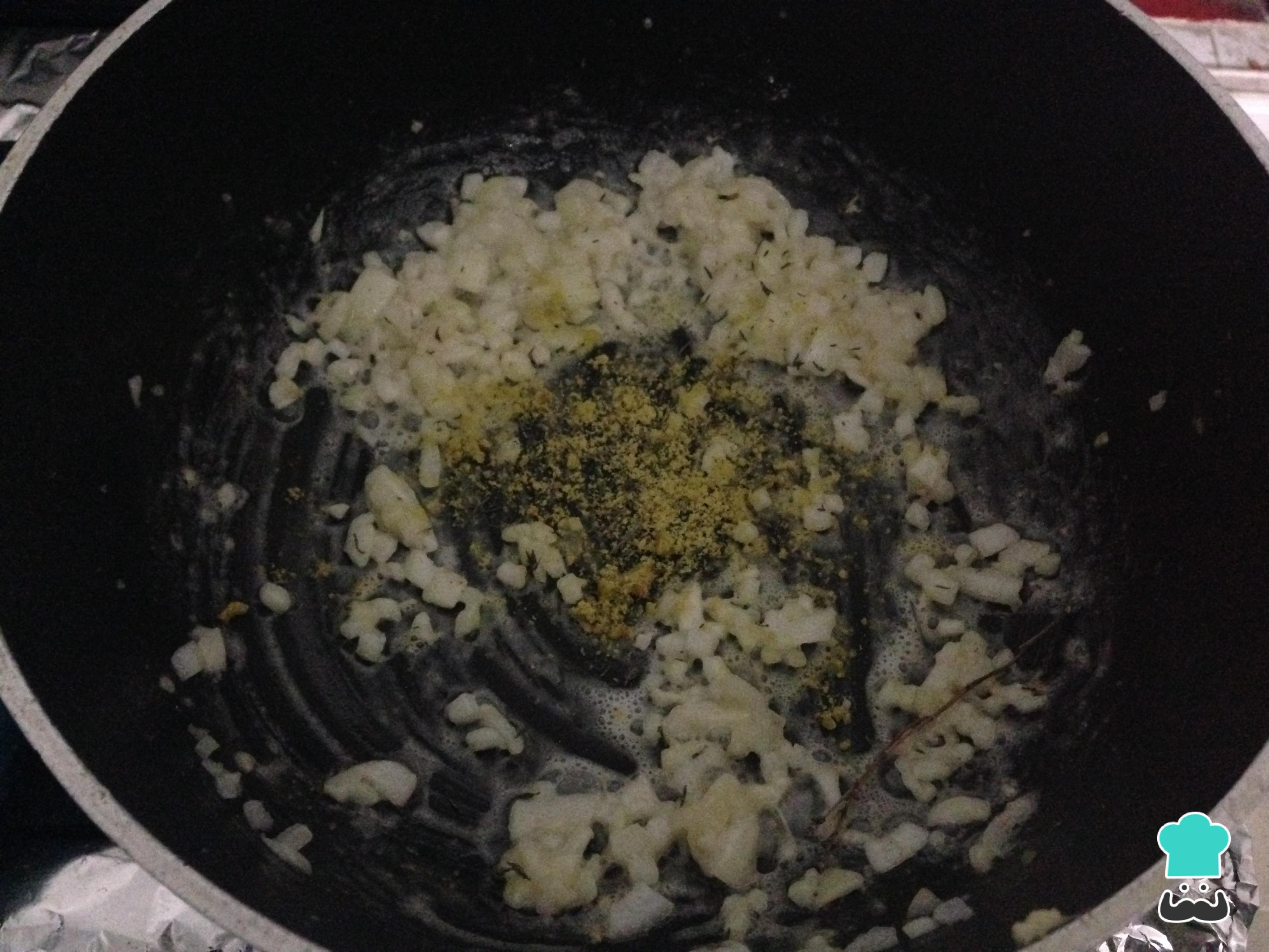 Cuando la cebolla este blanca agregar la cucharada de harina y medio cubo de caldo, cocinar por 3 minutos.