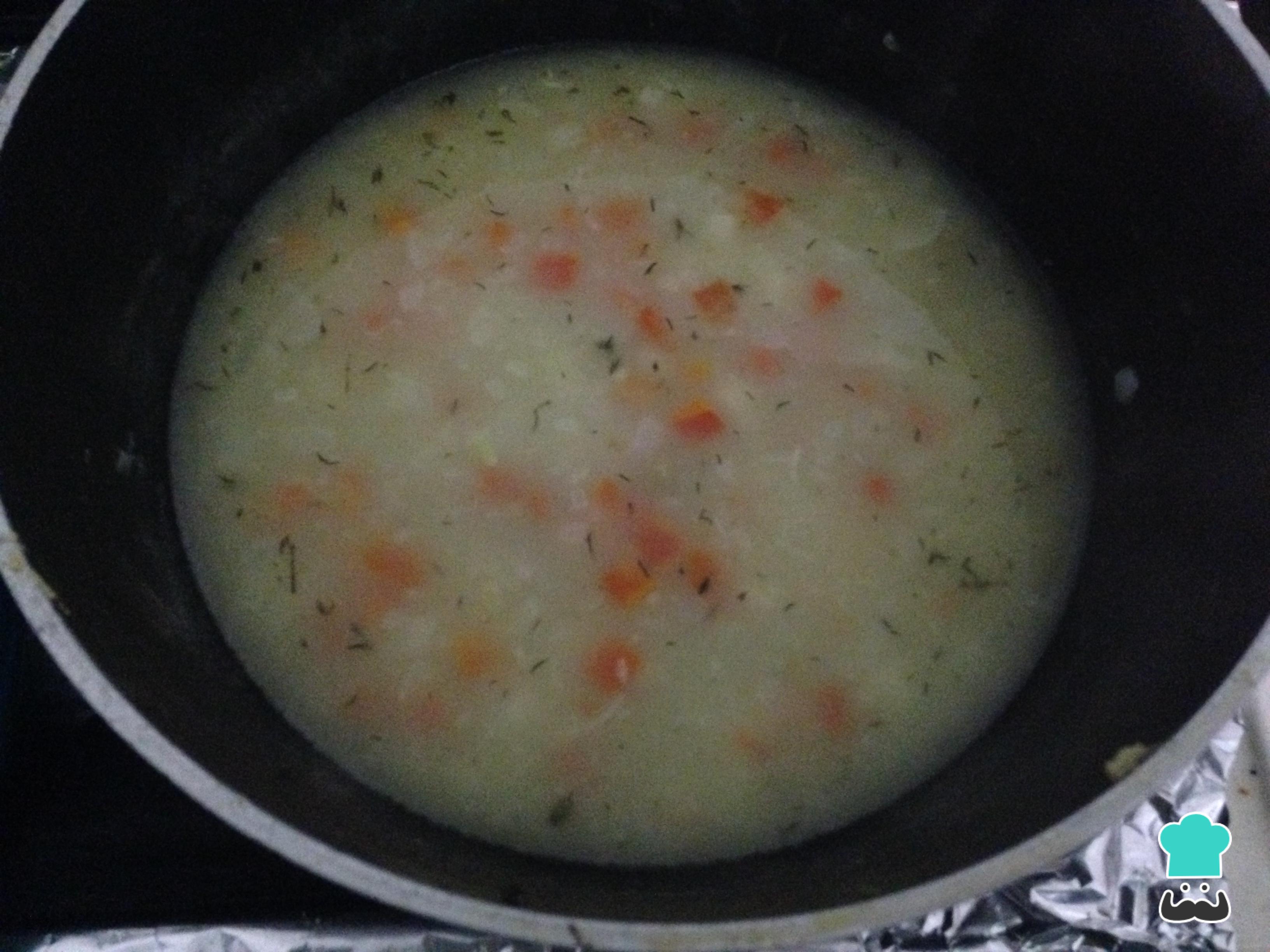 Agregar el caldo de pollo y ramitos de tomillo, cocinar por 3 minutos mas.