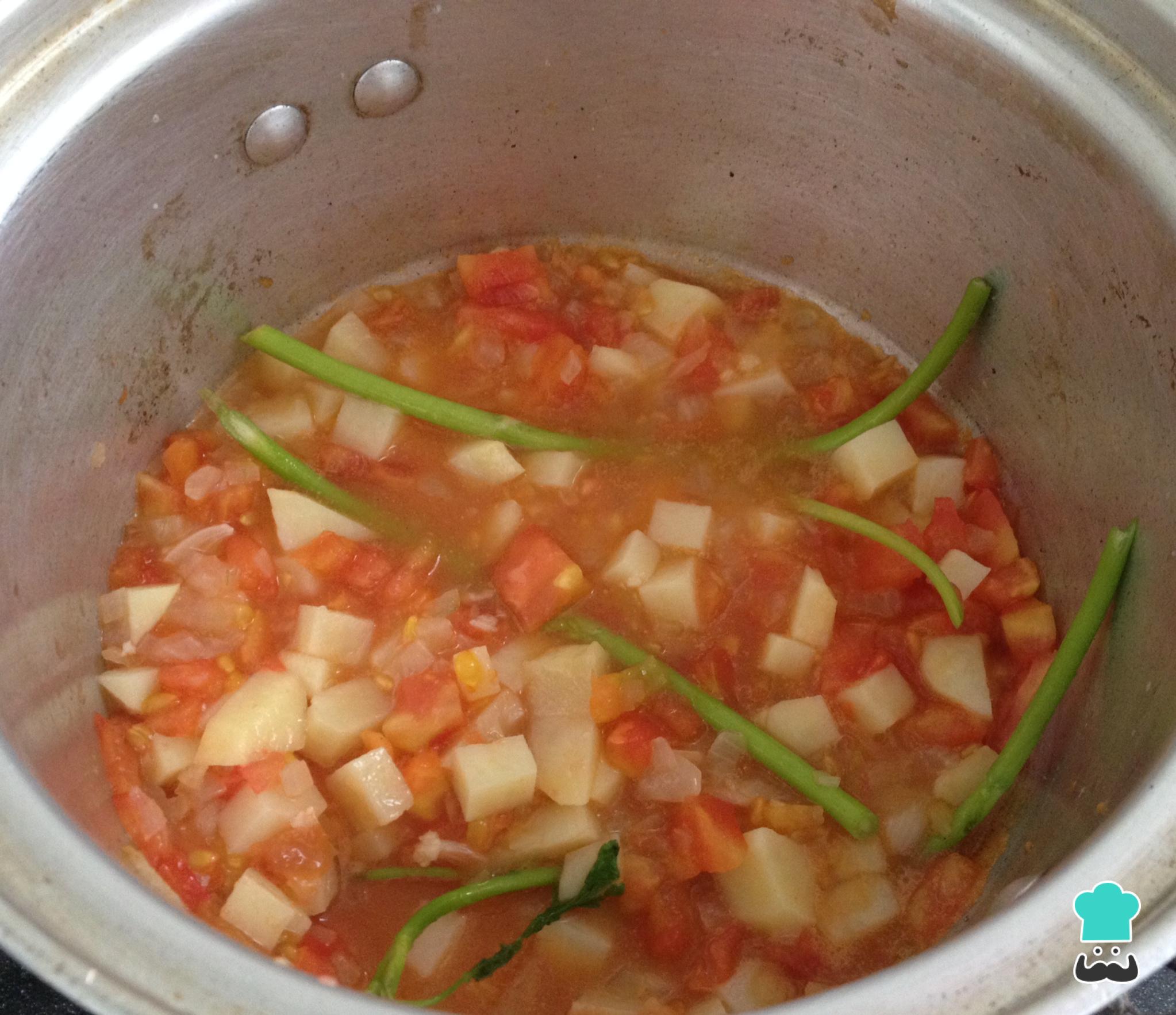Agregar el tomate sin piel, cortado en cubos pequeños,cuando suelte sus jugos añadir las patatas sin piel cortadas en cubos pequeños,salpimentar.