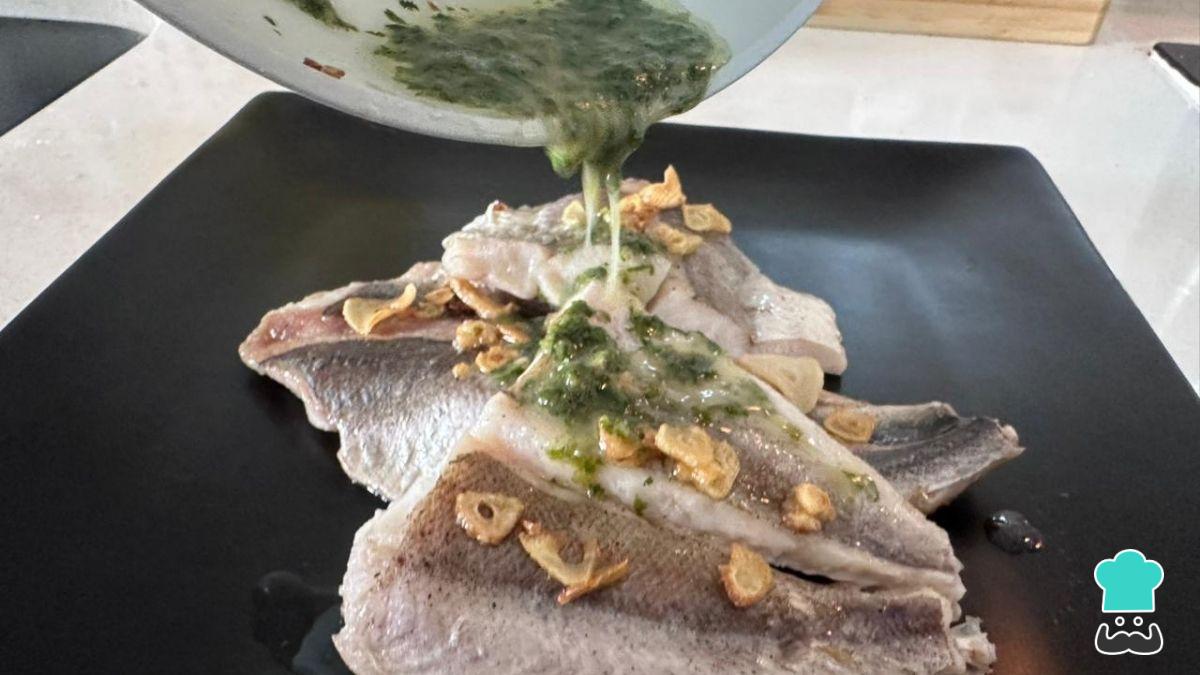 Mientras se cocina el pescado, calienta el aceite de oliva en una sartén pequeña. Añade los ajos laminados y la guindilla. Cocina a fuego medio-bajo hasta que los ajos estén dorados, pero no quemados (si se pasan, amargan).