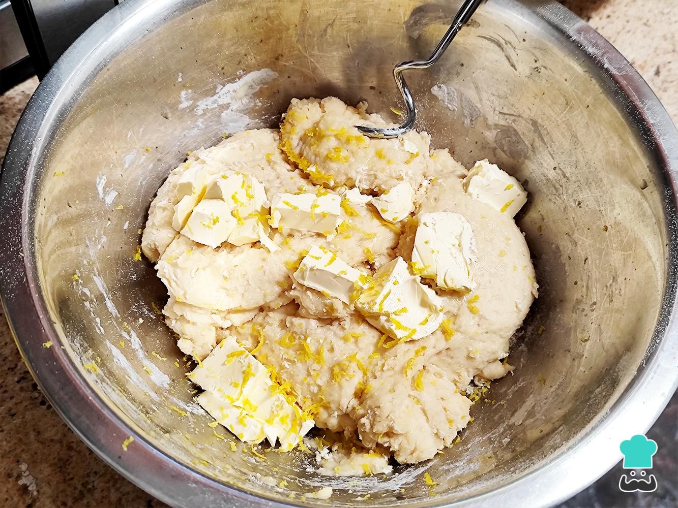 Agrega la mantequilla a temperatura ambiente y la ralladura de naranja, comienza a amasar por unos 10 minutos.