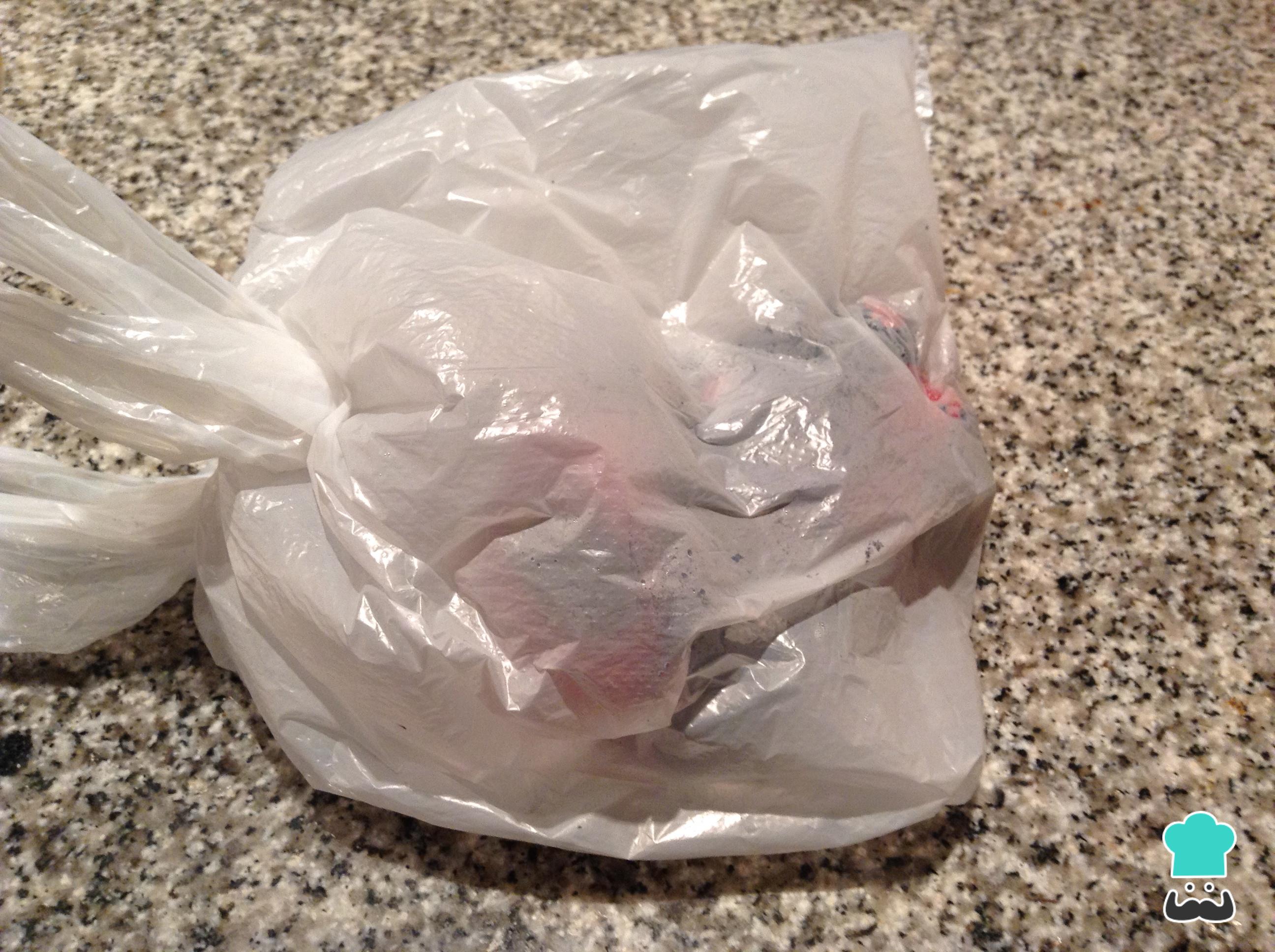 - Una vez este todo negro el pimiento o pimentón introducirlo en una bolsa plastica y cerrarla ( lo que va hacer esto es que el calor del pimentón haga que la parte negra sea mas facil de retirar). - Dejarlo ahi durante 10 minutos o 15 hasta que este tibio o frio.