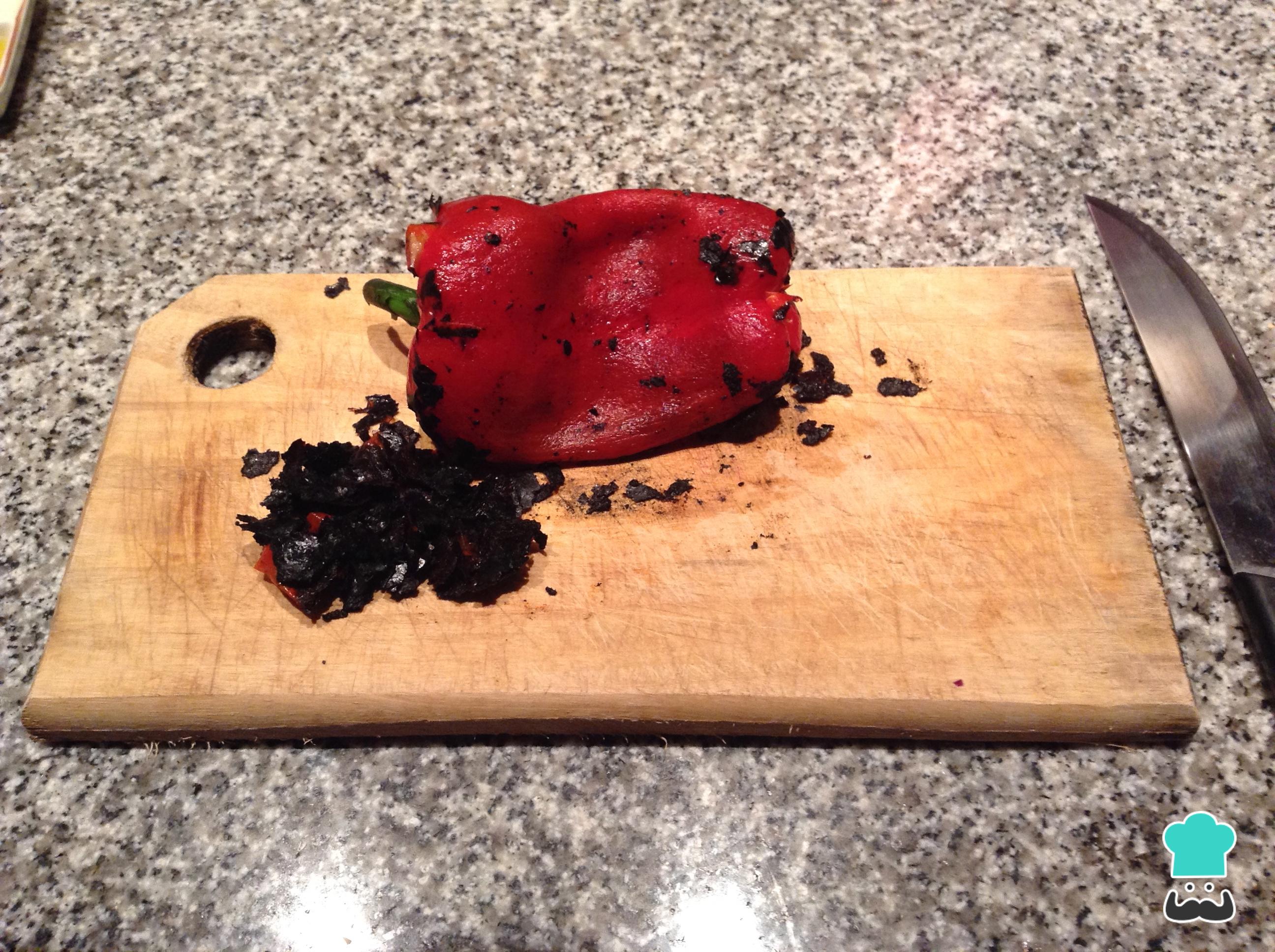 - Retirar el pimiento o pimentón de la bolsa y en una tabla quitarle toda la parte negra que es la cascara del pimiento o pimentón.