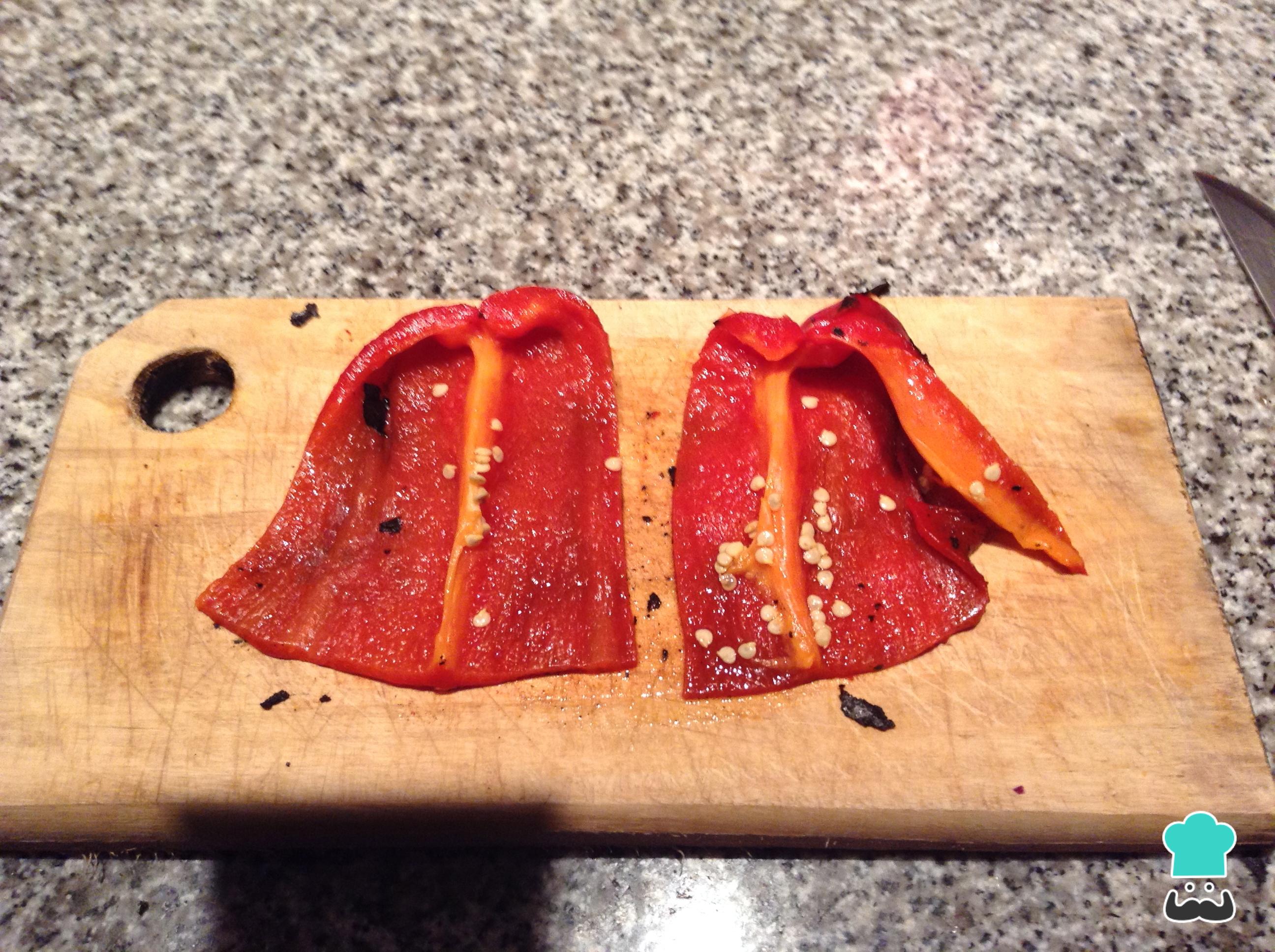- Una vez hayamos quitado todo la parte negra del pimiento o pimentón ahumado, abrirlo y retirar el corazon y las semillas.- Tambien debemos quitar toda esa vena blanca que tiene dentro.