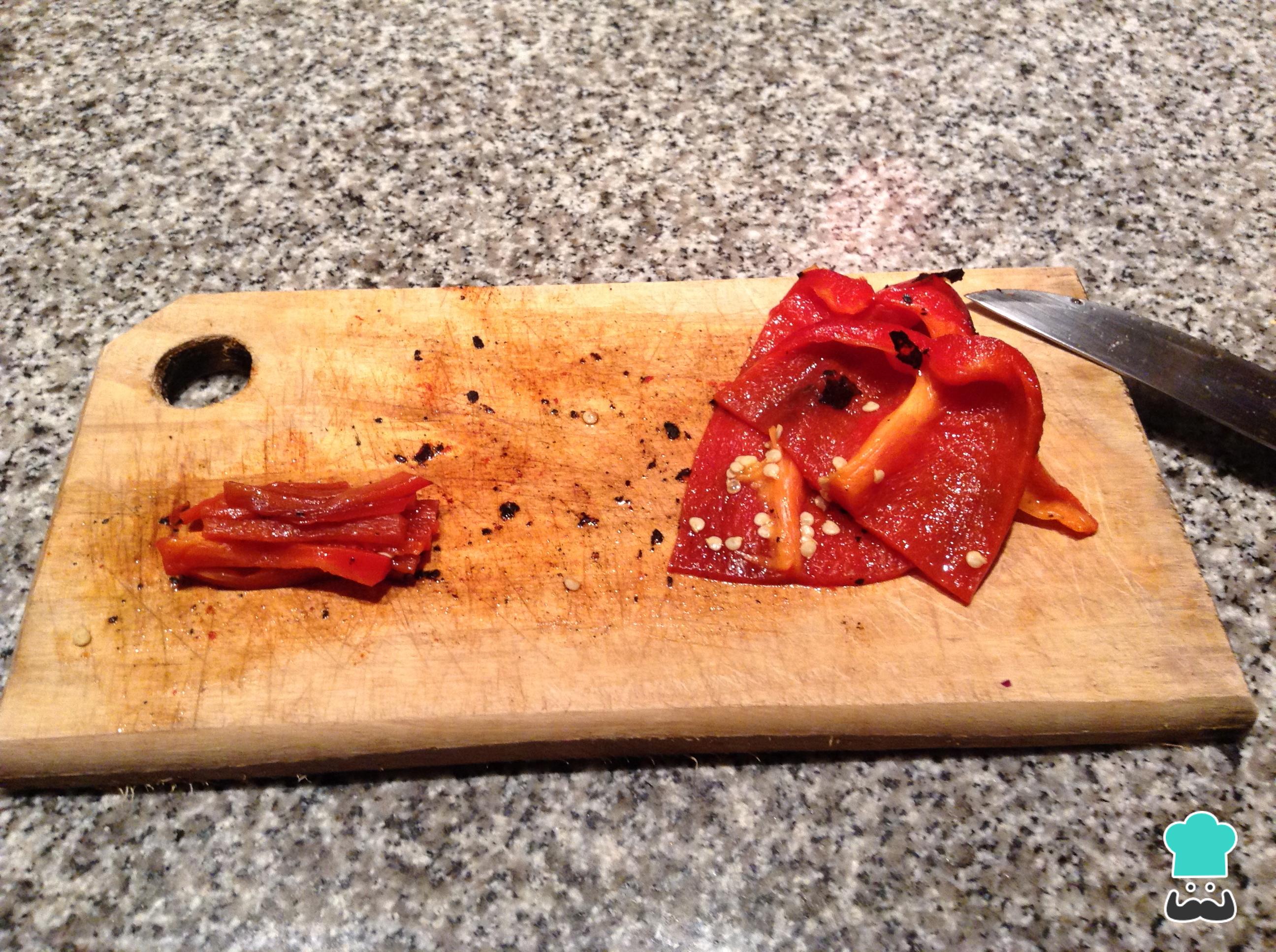 - Picar en bastones delgados las tiras de pimiento o pimentón.