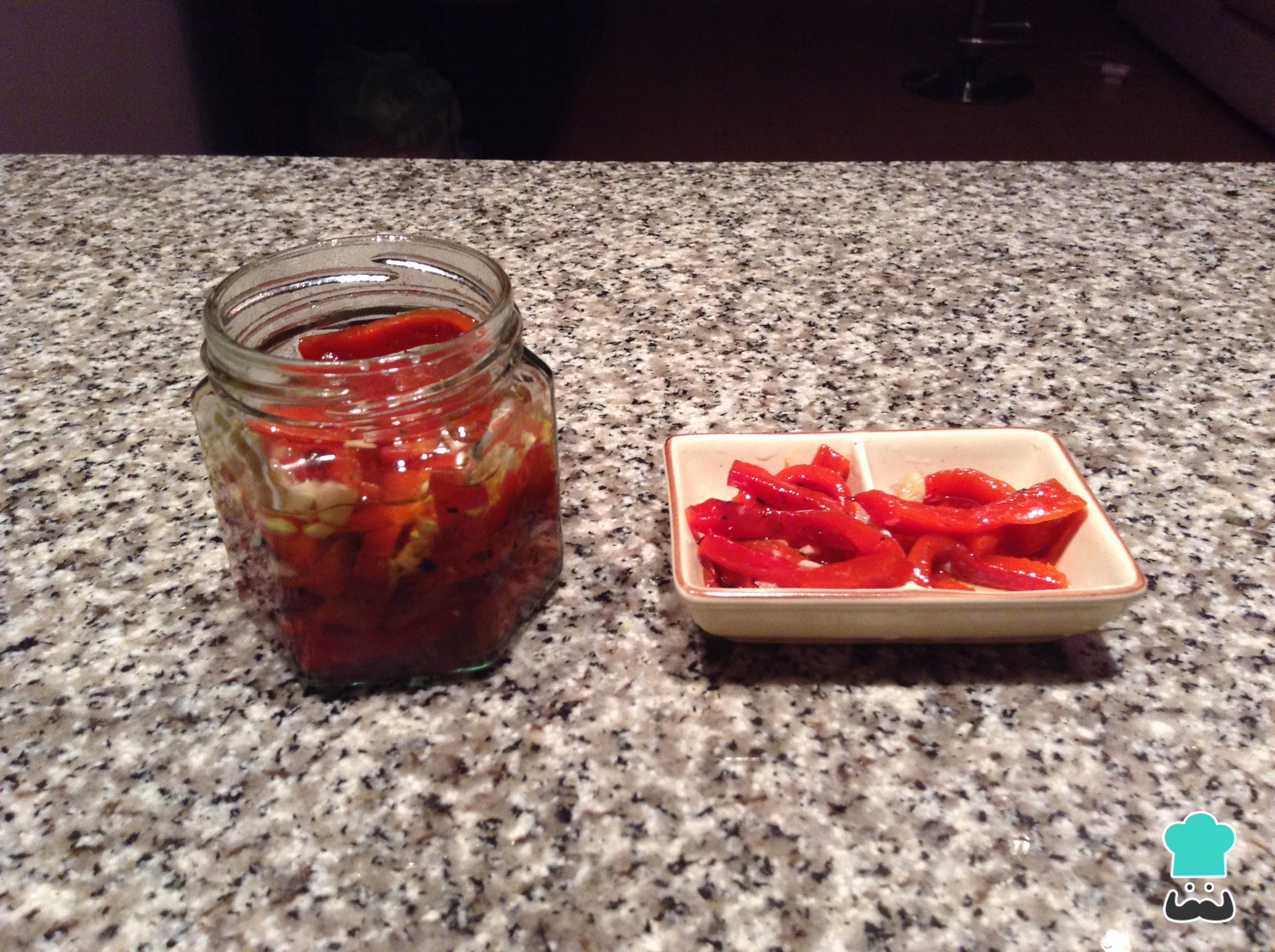 - Poner en un frasco las tiras con el ajo finamente picado, el aceite y el vinagre blanco.