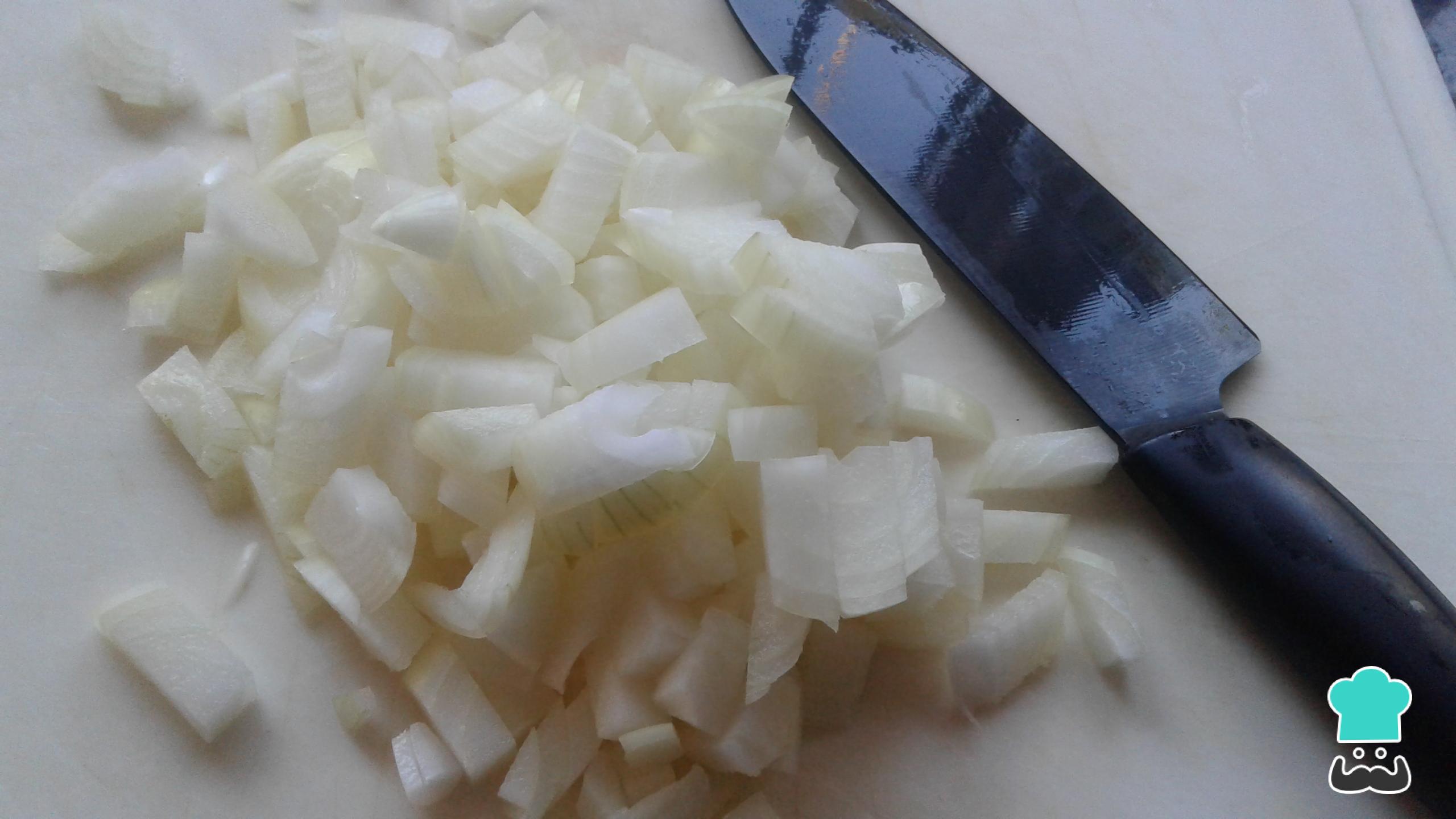 Para elaborar una musaka de berenjena sin carne, primero debes picar la cebolla en cubitos y verterles en una olla o en una sartén alta con 2 cucharadas de aceite. Señalamos que deben quedar transparentes y un poco doradas.