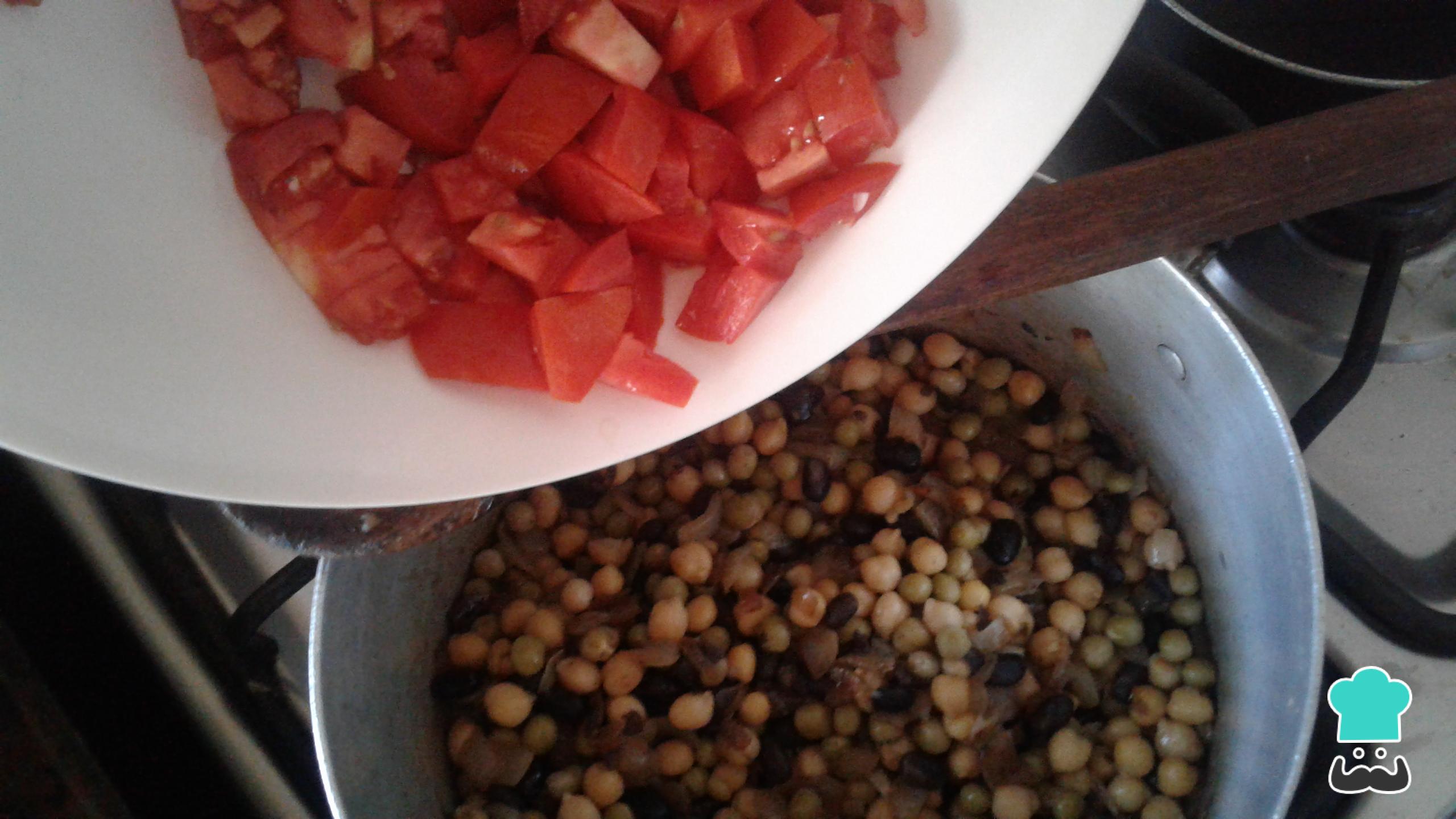Agrega las legumbres y cuando pasen 3 minutos, agrega el tomate ya cortado en cubitos con las semillas y todos sus nutrientes. El tomate lo debes cocinar por 5 minutos. A continuación, agrega la sal, la pimienta, el curry y por último, el ajo picado. Deja que se cocine unos minutos para que los sabores se fusionen. Una vez mezclados todos los ingredientes, apaga y reserva.