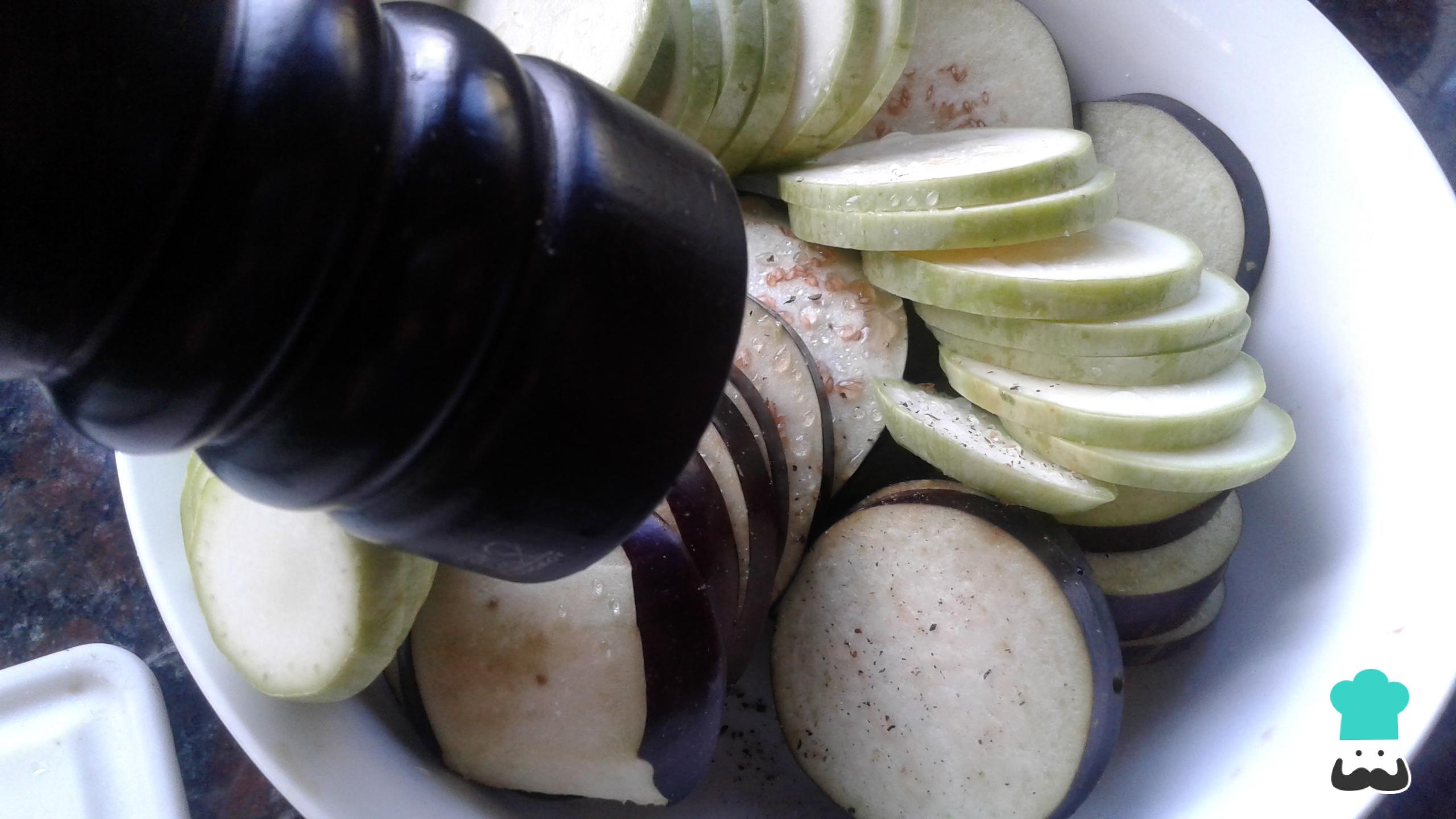 Corta la berenjena y el zucchini en rodajas finas, enseguida agregar sal y pimienta.
