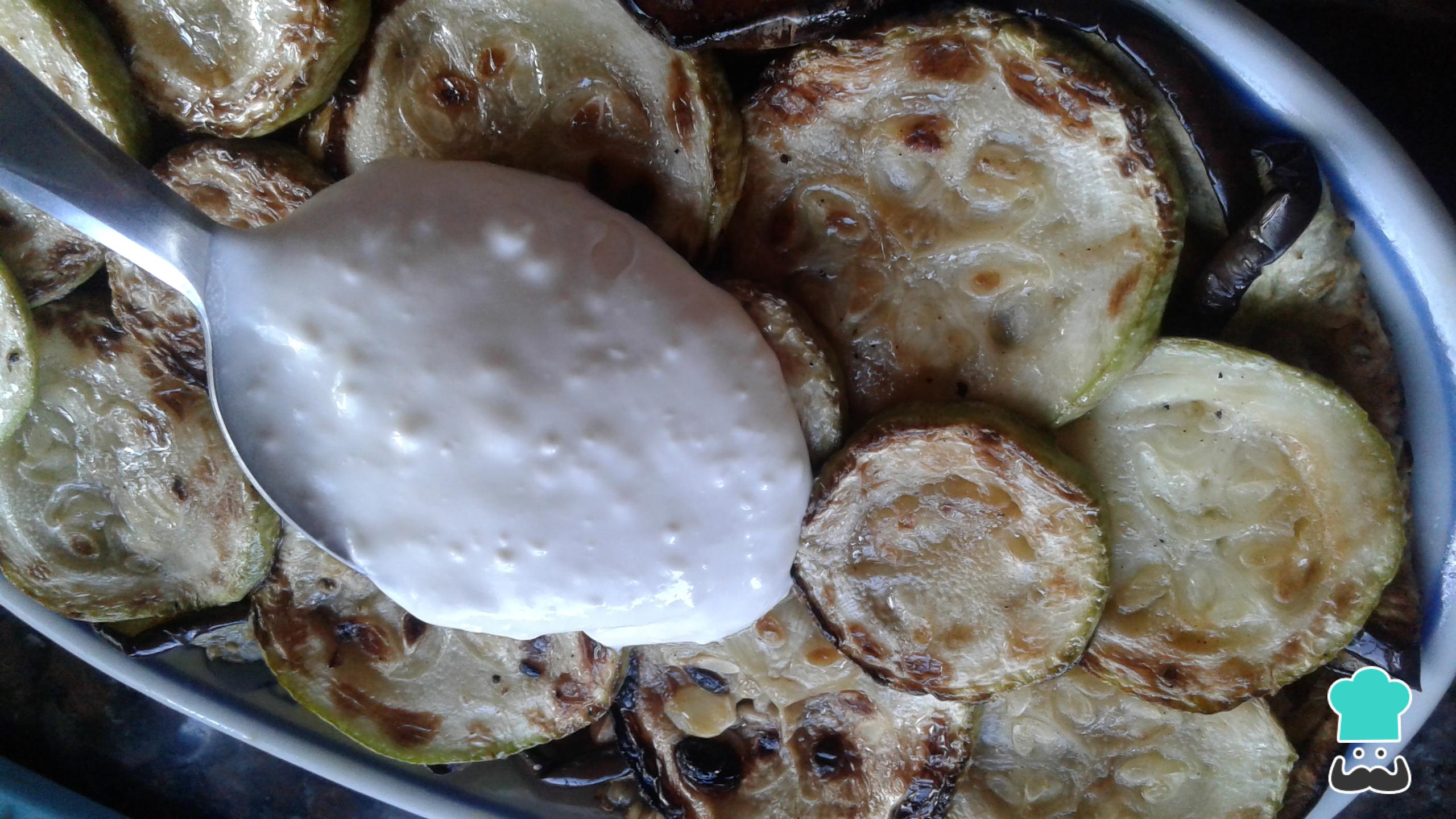 Cuando ya quedó el pastel armado, añade por encima el yogurt natural y llévalo al horno para que se dore. ¡Y listos para saborear esta deliciosa moussaka de verduras!