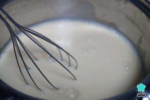 Lleva el cazo al fuego medio y calienta hasta que empiece a hervir. Cuando empiece a hervir, baja un poco el fuego y con unas varillas no dejes de seguir removiendo.