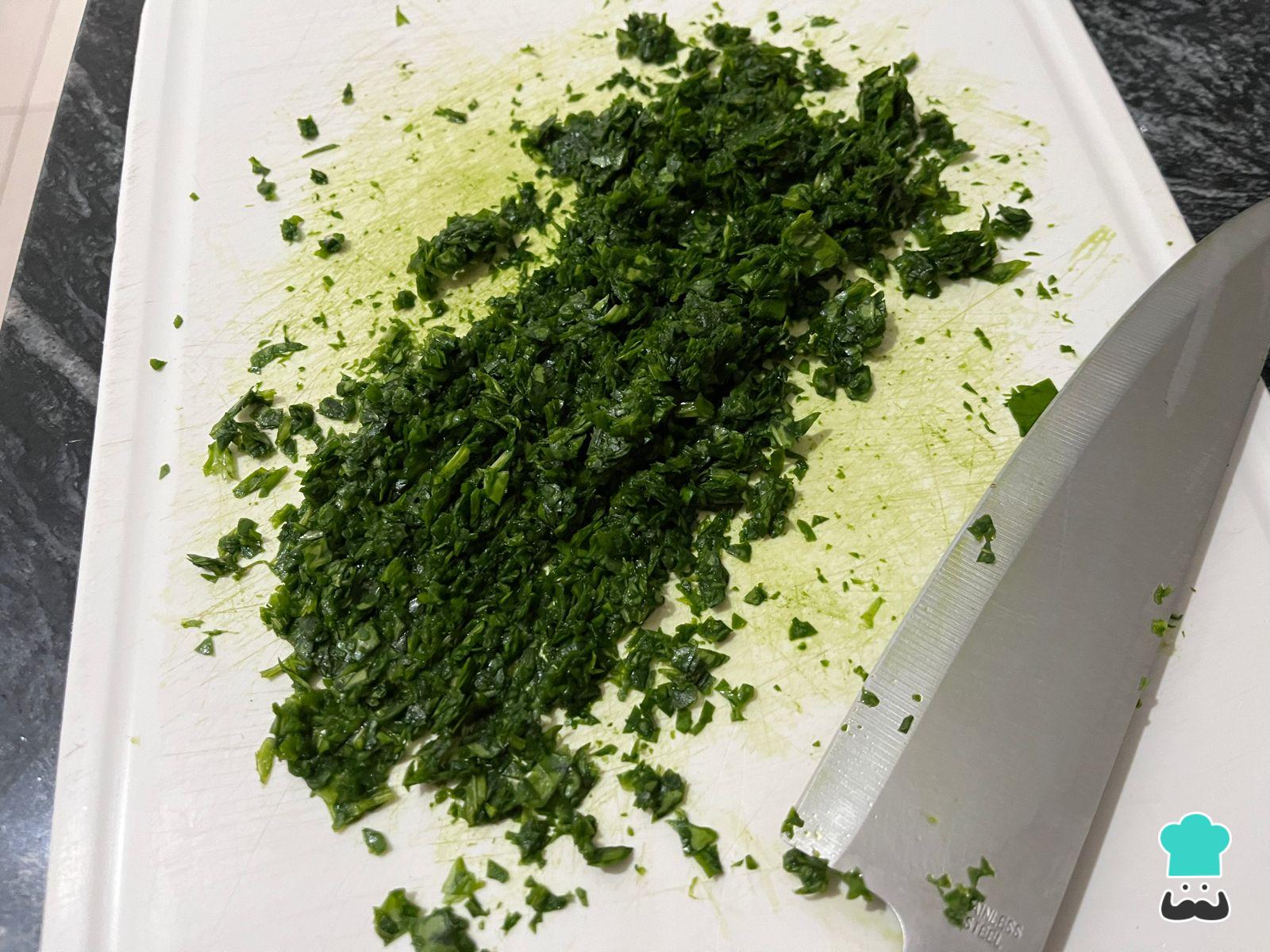 El primer paso para hacer estos ñoquis de espinaca sin papa es picar bien chiquita la espinaca. Si dispones de una procesadora, mixedora o licuadora, puedes hacerlo en ella. De esta forma, se unirá perfectamente con la harina, sin necesidad de cocinarla previamente, perdiendo el doble de nutrientes en dos cocciones. Asegúrate de desinfectarla en una solución de 1 gota de lavandina apta para alimentos por litro de agua por unos 15 minutos.