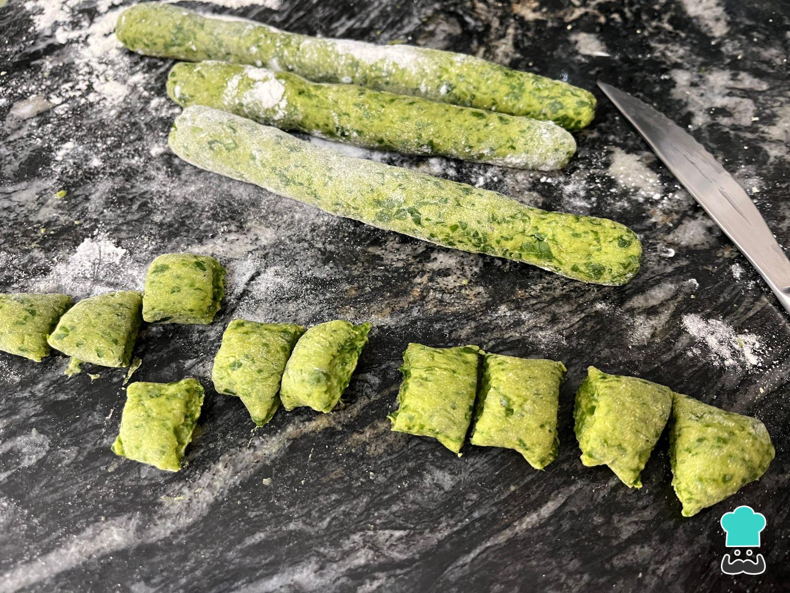 Divide la masa en rollos sobre una mesada limpia y enharinada para que no se pegue. Corta ñoquis del mismo tamaño para que su cocción sea uniforme.
