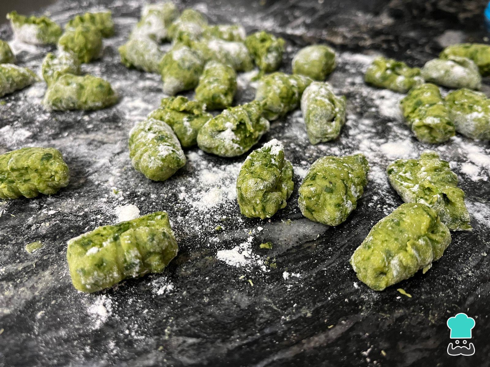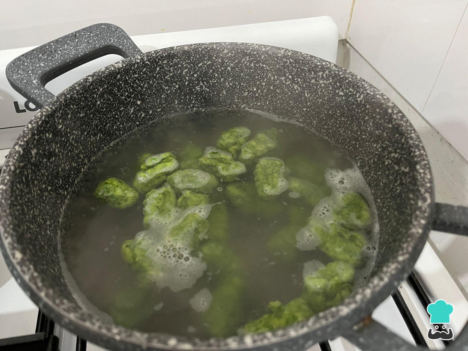 Cocina los ñoquis de espinaca sin papa en abundante agua hirviendo por 2 minutos desde que floten.