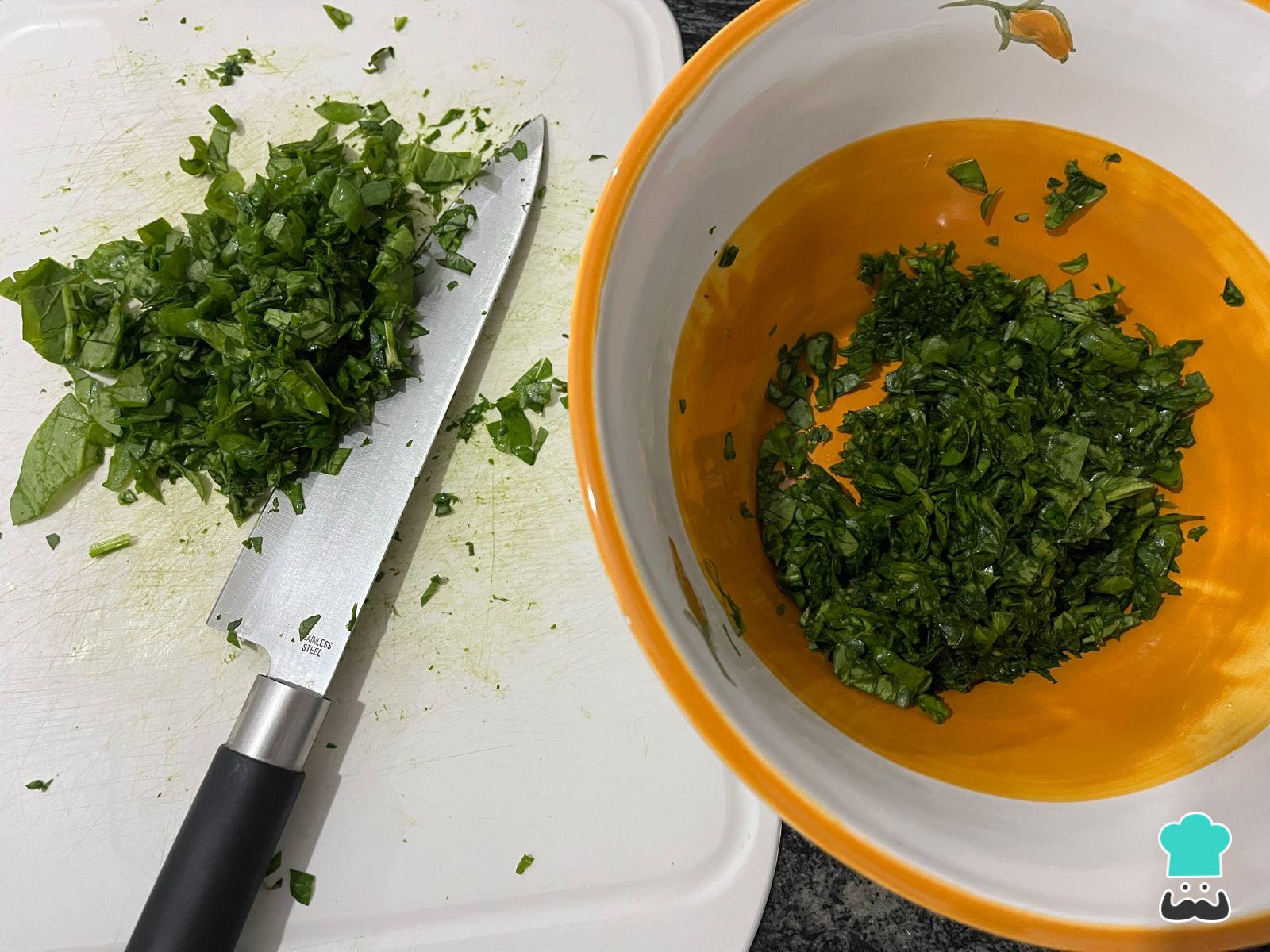 Para empezar con la preparación de los ñoquis de ricota y espinaca pica finamente la espinaca. Para que sus hojas estén bien limpias, deberás sumergirlas en una solución de 1 gota de lavandina apta para alimentos por litro de agua por unos 15 minutos. No las hervimos previamente para que no pierdan tantos nutrientes y rindan más.