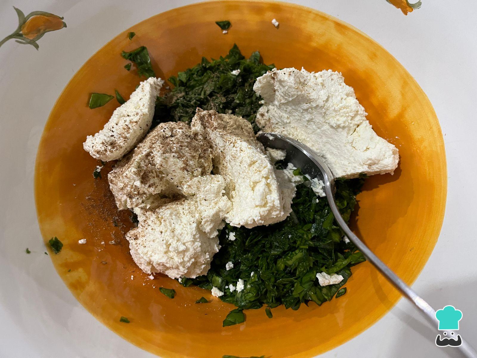 Mézclala con la ricota, debe estar bien seca o bien puedes escurrirla con ayuda de un trapo de cocina o repasador. Condimenta a gusto con la nuez moscada, queso rallado, pimienta y ajo en polvo.