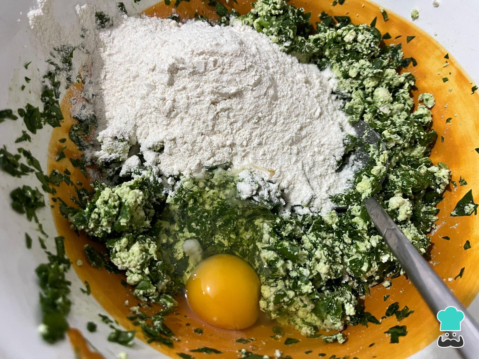 Cuando estés conforme con el sabor, agrega el huevo y la harina. Debes saber que, si deseas hacer ñoquis de ricota y espinaca sin gluten, puedes reemplazarla por maicena, así como por harina integral si prefieres una preparación con mayor aporte de fibra.