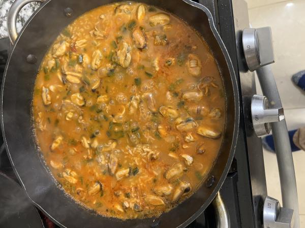 Añadimos el caldo de pescado, los mejillones limpios con solo una valva, un poquito de colorante (o hebras de azafrán, unas 20) y un poco de sal. Removemos todo y dejamos cocinar la paella marinera 5 minutos a fuego un poco fuerte, luego lo bajamos un poco y dejamos cocinar unos 10-12 minutos más. O hasta que el arroz quede como nos gusta.