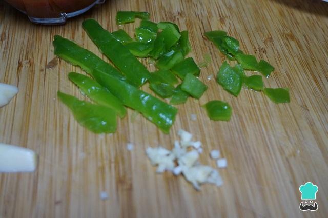 Para empezar con la preparación de la paella marinera, deberás dejar listos todos los ingredientes. Primero picamos los dientes de ajos y el pimiento verde. Rallamos los tomates o no si utilizaremos tomate triturado.
